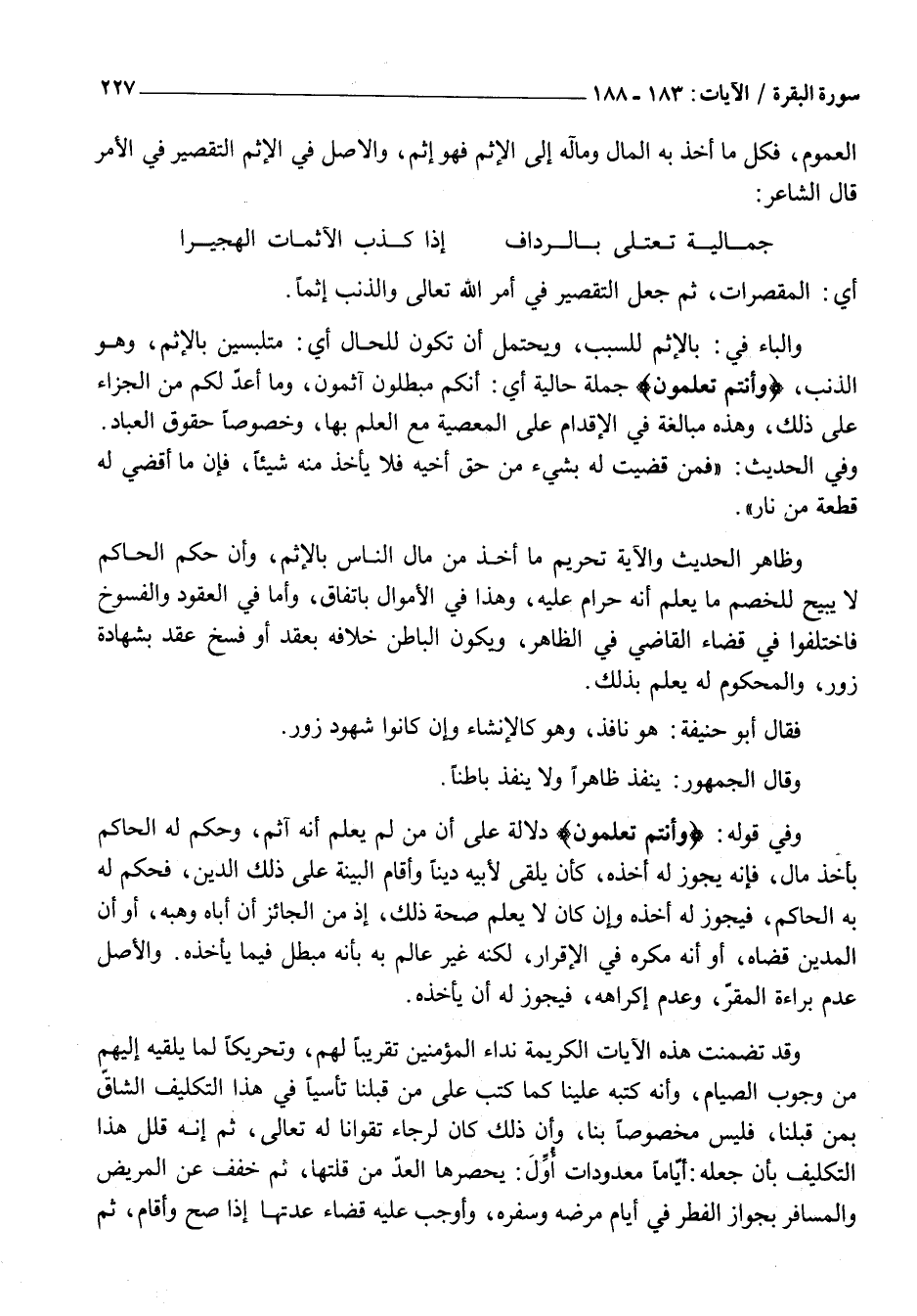 وَفِي قَوْلِهِ: وَأَنْتُمْ تَعْلَمُونَ دَلَالَةٌ عَلَى أَنَّ مَنْ لَمْ يَعْلَمْ أَنَّهُ آثِمٌ، وَحَكَمَ لَهُ الْحَاكِمُ بِأَخْذِ مَالٍ، فَإِنَّهُ يَجُوزُ لَهُ أَخَذُهُ، كَأَنْ يَلْقَى لِأَبِيهِ دَيْنًا وَأَقَامَ الْبَيِّنَةَ عَلَى ذَلِكَ الدَّيْنِ، فَحَكَمَ لَهُ بِهِ الْحَاكِمُ، فَيَجُوزُ لَهُ أَخْذُهُ وَإِنْ كَانَ لَا يَعْلَمُ صِحَّةَ ذَلِكَ، إِذْ مِنَ الْجَائِزِ أَنَّ أَبَاهُ وَهَبَهُ، أَوْ أَنَّ الْمَدِينَ قَضَاهُ، أَوْ أَنَّهُ مُكْرَهٌ فِي الْإِقْرَارِ، لَكِنَّهُ غَيْرُ عَالِمٍ بِهِ بِأَنَّهُ مُبْطِلٌ فِيمَا يَأْخُذُهُ. وَالْأَصْلُ عَدَمُ بَرَاءَةِ الْمُقِرِّ، وَعَدَمُ إِكْرَاهِهِ، فَيَجُوزُ لَهُ أَنْ يَأْخُذَهُ.