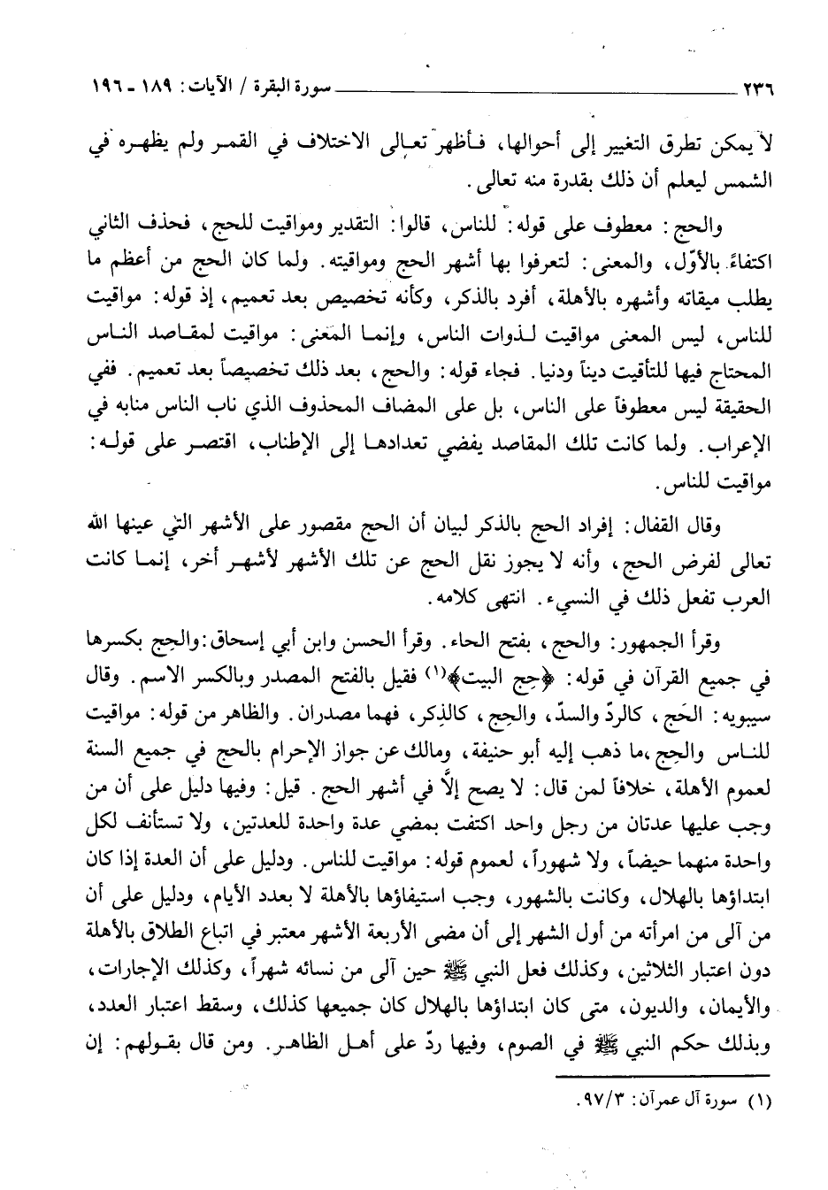 وَالْحَجُّ: مَعْطُوفٌ عَلَى قَوْلِهِ: لِلنَّاسِ، قَالُوا: التَّقْدِيرُ وَمَوَاقِيتُ لِلْحَجِّ، فَحُذِفَ الثَّانِي اكْتِفَاءً بِالْأَوَّلِ، وَالْمَعْنَى: لِتَعْرِفُوا بِهَا أَشْهُرَ الْحَجِّ وَمَوَاقِيتَهُ. وَلَمَّا كَانَ الْحَجُّ مِنْ أَعْظَمِ مَا يُطْلَبُ مِيقَاتُهُ وَأَشْهُرُهُ بِالْأَهِلَّةِ، أُفْرِدَ بِالذِّكْرِ، وَكَأَنَّهُ تَخْصِيصٌ بَعْدَ تَعْمِيمٍ، إِذْ قَوْلُهُ: مَوَاقِيتُ لِلنَّاسِ، لَيْسَ الْمَعْنَى مَوَاقِيتَ لِذَوَاتِ النَّاسِ، وَإِنَّمَا الْمَعْنَى: مَوَاقِيتُ لِمَقَاصِدِ النَّاسِ الْمُحْتَاجِ فِيهَا لِلتَّأْقِيتِ دِينًا وَدُنْيَا. فَجَاءَ قَوْلُهُ: وَالْحَجِّ، بَعْدَ ذَلِكَ تَخْصِيصًا بَعْدَ تَعْمِيمٍ. فَفِي الْحَقِيقَةِ لَيْسَ مَعْطُوفًا عَلَى النَّاسِ، بَلْ عَلَى الْمُضَافِ الْمَحْذُوفِ الَّذِي نَابَ النَّاسُ مَنَابَهُ فِي الْإِعْرَابِ. وَلَمَّا كَانَتْ تِلْكَ الْمَقَاصِدُ يُفْضِي تَعْدَادُهَا إِلَى الْإِطْنَابِ، اقْتَصَرَ عَلَى قَوْلِهِ: