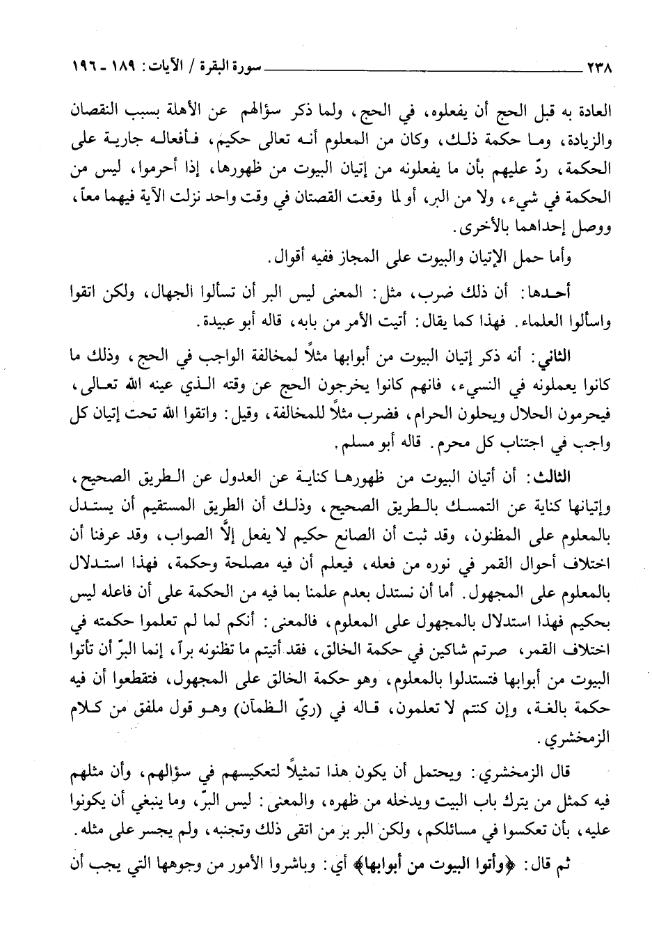 الثَّالِثُ: أَنَّ إِتْيَانَ الْبُيُوتِ مِنْ ظُهُورِهَا كِنَايَةٌ عَنِ الْعُدُولِ عَنِ الطَّرِيقِ الصحيح، وإتيانها كِنَايَةٌ عَنِ التَّمَسُّكِ بِالطَّرِيقِ الصَّحِيحِ، وَذَلِكَ أَنَّ الطَّرِيقَ الْمُسْتَقِيمَ أَنْ يَسْتَدِلَّ بِالْمَعْلُومِ عَلَى الْمَظْنُونِ، وَقَدْ ثَبَتَ أَنَّ الصَّانِعَ حَكِيمٌ لَا يَفْعَلُ إِلَّا الصَّوَابَ، وَقَدْ عَرَفْنَا أَنَّ اخْتِلَافَ أَحْوَالِ الْقَمَرِ فِي نُورِهِ مِنْ فِعْلِهِ، فَيُعْلَمُ أَنَّ فِيهِ مَصْلَحَةً وَحِكْمَةً، فَهَذَا اسْتِدْلَالٌ بِالْمَعْلُومِ عَلَى الْمَجْهُولِ. أَمَّا أَنْ نَسْتَدِلَّ بِعَدَمِ عِلْمِنَا بِمَا فِيهِ مِنَ الْحِكْمَةِ عَلَى أَنَّ فَاعِلَهُ لَيْسَ بِحَكِيمٍ فَهَذَا اسْتِدْلَالٌ بِالْمَجْهُولِ عَلَى الْمَعْلُومِ، فَالْمَعْنَى: أَنَّكُمْ لَمَّا لَمْ تَعْلَمُوا حِكْمَتَهُ فِي اخْتِلَافِ الْقَمَرِ، صِرْتُمْ شَاكِّينَ فِي حِكْمَةِ الْخَالِقِ، فَقَدْ أَتَيْتُمْ مَا تَظُنُّونَهُ بِرًّا، إِنَّمَا الْبِرُّ أَنْ تَأْتُوا الْبُيُوتَ مِنْ أَبْوَابِهَا فَتَسْتَدِلُّوا بِالْمَعْلُومِ، وَهُوَ حِكْمَةُ الْخَالِقِ عَلَى الْمَجْهُولِ، فَتَقْطَعُوا أَنَّ فِيهِ حِكْمَةً بَالِغَةً، وَإِنْ كُنْتُمْ لَا تَعْلَمُونَ، قَالَهُ فِي (رِيِّ الظَّمْآنِ) وَهُوَ قَوْلٌ مُلَفَّقٌ مِنْ كَلَامِ الزَّمَخْشَرِيِّ.
