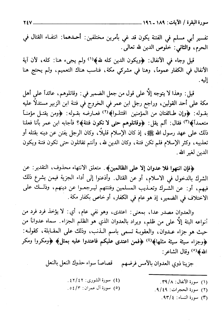 فَإِنِ انْتَهَوْا فَلا عُدْوانَ إِلَّا عَلَى الظَّالِمِينَ. مُتَعَلَّقُ الِانْتِهَاءِ مَحْذُوفٌ، التَّقْدِيرُ: عَنِ الشِّرْكِ بِالدُّخُولِ فِي الْإِسْلَامِ، أَوْ عَنِ الْقِتَالِ. وَأَذْعَنُوا إِلَى أَدَاءِ الْجِزْيَةِ فِيمَنْ يُشْرَعُ ذَلِكَ فِيهِمْ، أَوْ: عَنِ الشِّرْكِ وَتَعْذِيبِ الْمُسْلِمِينَ وَفِتْنَتِهِمْ لِيَرْجِعُوا عَنْ دِينِهِمْ، وَذَلِكَ عَلَى الِاخْتِلَافِ فِي الضَّمِيرِ، إِذْ هُوَ عَامٌّ فِي الْكُفَّارِ، أَوْ خَاصٌّ بِكُفَّارِ مَكَّةَ.