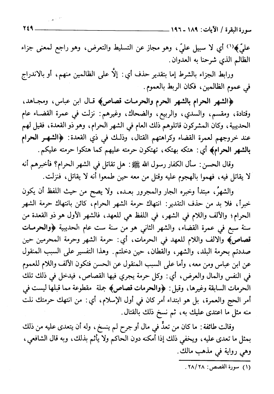 وَالشَّهْرُ، مُبْتَدَأٌ وَخَبَرُهُ الْجَارُّ وَالْمَجْرُورُ بَعْدَهُ، وَلَا يَصِحُّ مِنْ حَيْثُ اللَّفْظُ أَنْ يَكُونَ خَبَرًا، فَلَا بُدَّ مِنْ حَذْفِ التقدير: انْتِهَاكُ حُرْمَةِ الشَّهْرِ الْحَرَامِ، كَائِنٌ بِانْتِهَاكِ حُرْمَةِ الشَّهْرِ الْحَرَامِ وَالْأَلِفُ وَاللَّامُ فِي الشَّهْرِ، فِي اللَّفْظِ هِيَ لِلْعَهْدِ، فَالشَّهْرُ الْأَوَّلُ هُوَ ذُو الْقَعْدَةِ مِنْ سَنَةِ سَبْعٍ فِي عُمْرَةِ الْقَضَاءِ، وَالشَّهْرُ الثَّانِي هُوَ مِنْ سَنَةِ سِتٍّ عَامَ الْحُدَيْبِيَةَ وَالْحُرُماتُ قِصاصٌ وَالْأَلِفُ وَاللَّامُ لِلْعَهْدِ فِي الْحُرُمَاتِ، أَيْ: حُرْمَةُ الشَّهْرِ وَحُرْمَةُ الْمُحْرِمِينَ حِينَ صَدَدْتُمْ بِحُرْمَةِ الْبَلَدِ، والشهر، والقطان، حِينَ دَخَلْتُمْ. وَهَذَا التَّفْسِيرُ عَلَى السَّبَبِ الْمَنْقُولِ عَنِ ابْنِ عَبَّاسٍ وَمَنْ مَعَهُ، وَأَمَّا عَلَى السَّبَبِ الْمَنْقُولِ عَنِ الْحَسَنِ فَتَكُونُ الْأَلِفُ وَاللَّامُ لِلْعُمُومِ فِي النَّفْسِ وَالْمَالِ وَالْعِرْضِ، أَيْ: وَكُلُّ حُرْمَةٍ يَجْرِي فِيهَا الْقِصَاصُ، فَيَدْخُلُ فِي ذَلِكَ تِلْكَ الْحُرُمَاتُ السَّابِقَةُ وَغَيْرُهَا، وَقِيلَ: وَالْحُرُماتُ قِصاصٌ جُمْلَةٌ مَقْطُوعَةٌ مِمَّا قَبْلَهَا لَيْسَتْ فِي أَمْرِ الْحَجِّ وَالْعُمْرَةِ، بَلْ هُوَ ابْتِدَاءُ أَمْرٍ كَانَ فِي أَوَّلِ الْإِسْلَامِ، أَيْ: مَنِ انْتَهَكَ حُرْمَتَكَ نِلْتَ مِنْهُ مِثْلَ مَا اعْتَدَى عَلَيْكَ بِهِ، ثُمَّ نُسِخَ ذَلِكَ بِالْقِتَالِ.