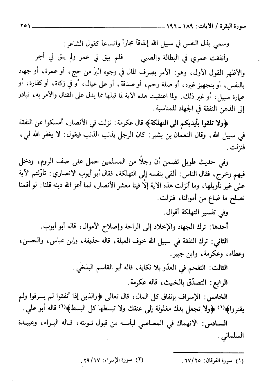 وَلا تُلْقُوا بِأَيْدِيكُمْ إِلَى التَّهْلُكَةِ قَالَ عِكْرِمَةُ: نَزَلَتْ فِي الْأَنْصَارِ، أَمْسَكُوا عَنِ النَّفَقَةِ فِي سَبِيلِ اللَّهِ، وَقَالَ النُّعْمَانُ بْنُ بَشِيرٍ: كَانَ الرَّجُلُ يُذْنِبُ الذَّنْبَ فَيَقُولُ: لَا يَغْفِرُ اللَّهُ لِي، فَنَزَلَتْ.
