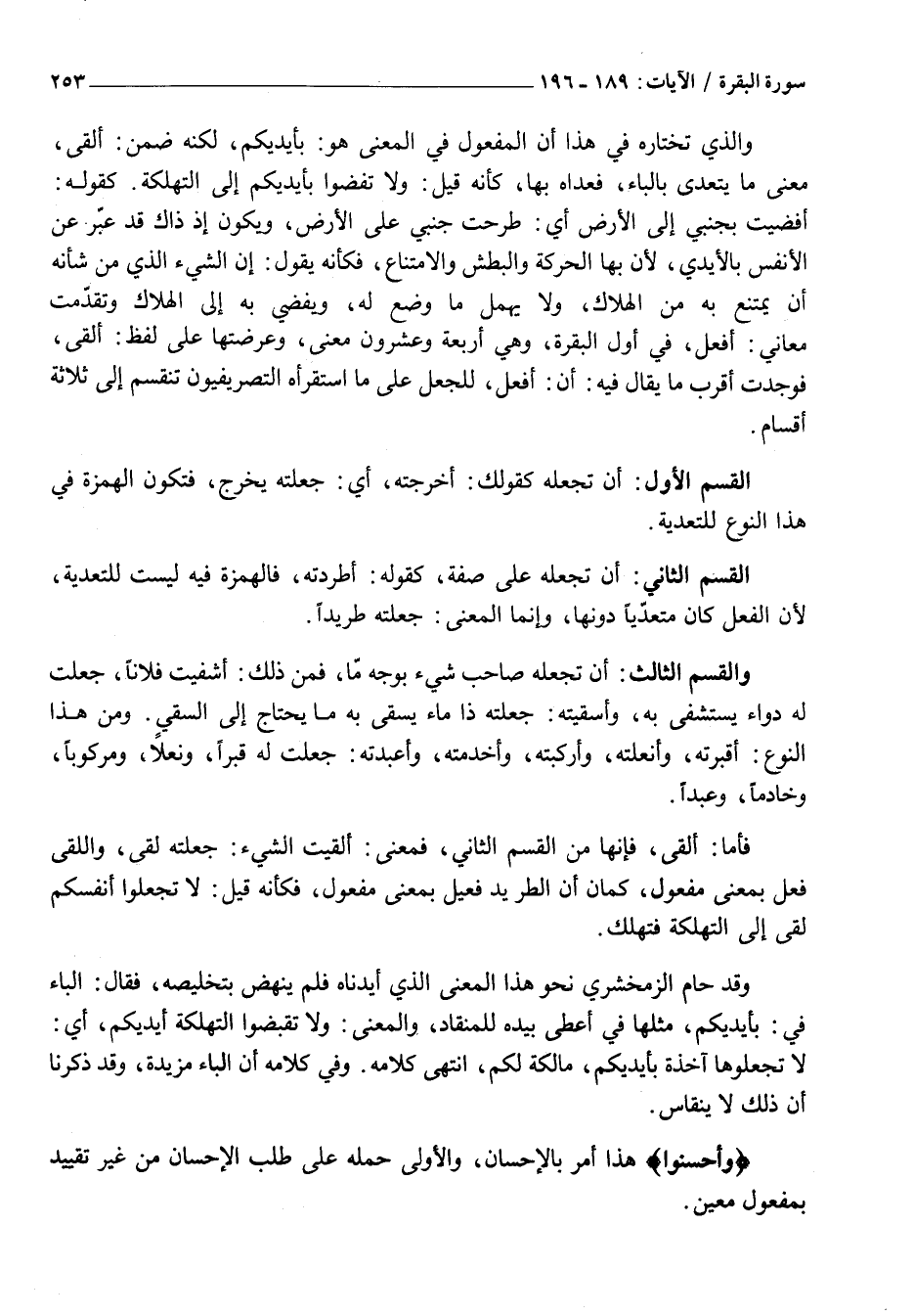 أَفْضَيْتُ بِجَنْبِي إِلَى الْأَرْضِ أَيْ: طَرَحْتُ جَنْبِي عَلَى الْأَرْضِ، وَيَكُونُ إِذْ ذَاكَ قَدْ عَبَّرَ عَنِ الْأَنْفُسِ بِالْأَيْدِي، لِأَنَّ بِهَا الْحَرَكَةَ وَالْبَطْشَ وَالِامْتِنَاعَ، فَكَأَنَّهُ يَقُولُ: إِنَّ الشَّيْءَ الَّذِي مِنْ شَأْنِهِ أَنْ يُمْتَنَعَ بِهِ مِنَ الْهَلَاكِ، وَلَا يُهْمَلَ مَا وُضِعَ لَهُ، وَيُفْضَى بِهِ إِلَى الْهَلَاكِ وَتَقَدَّمَتْ مَعَانِي: أَفْعَلَ، فِي أَوَّلِ الْبَقَرَةِ، وَهِيَ أَرْبَعَةٌ وَعِشْرُونَ مَعْنًى، وَعَرَضْتُهَا عَلَى لَفْظِ: أَلْقَى، فَوَجَدْتُ أَقْرَبَ مَا يُقَالُ فِيهِ: أَنَّ: أَفْعَلَ، لِلْجَعْلِ عَلَى مَا اسْتَقْرَأَهُ التَّصْرِيفِيُّونَ تَنْقَسِمُ إِلَى ثَلَاثَةِ أَقْسَامٍ.