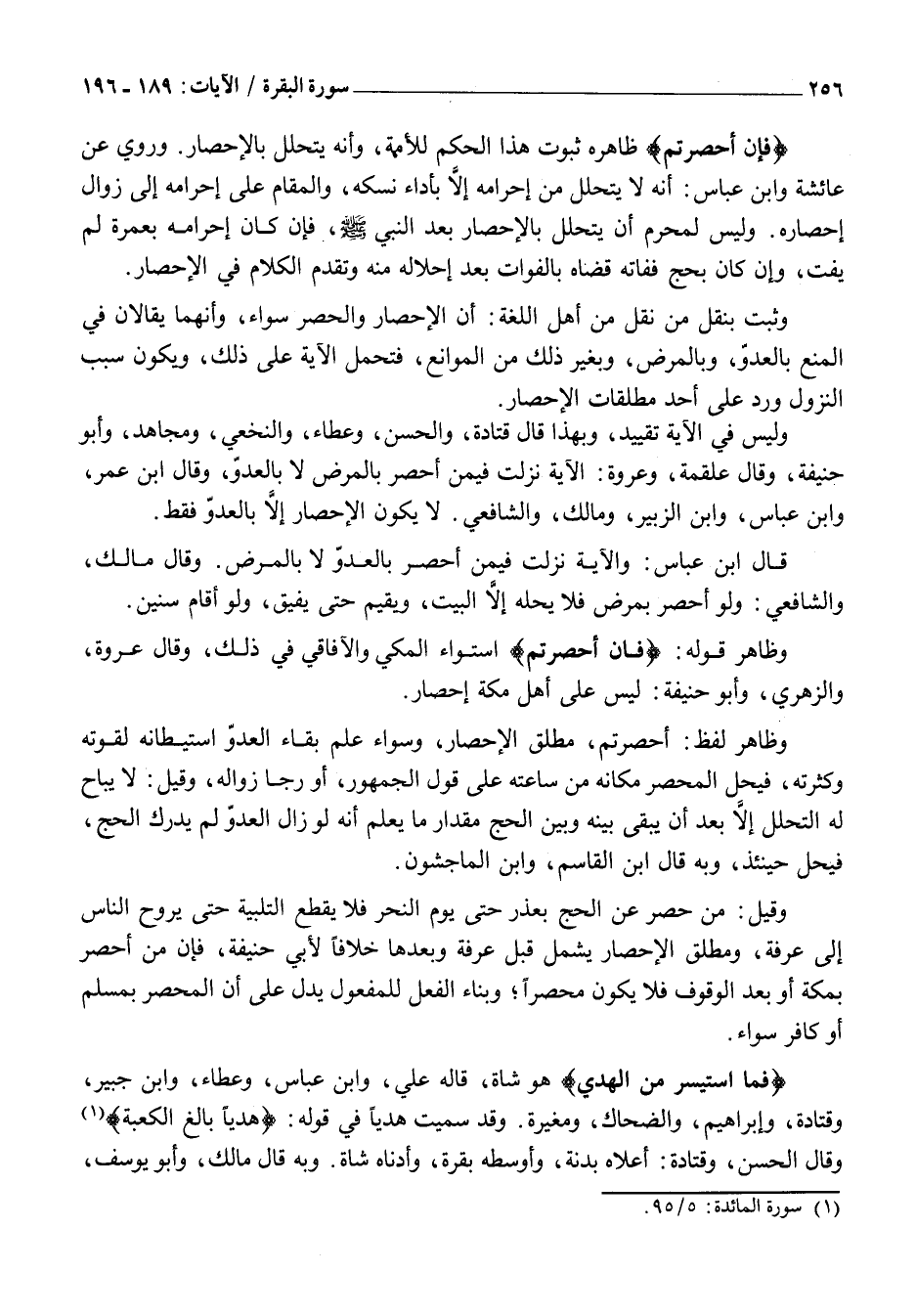 وَلَيْسَ فِي الْآيَةِ تَقْيِيدٌ، وَبِهَذَا قَالَ قَتَادَةُ، وَالْحَسَنُ، وَعَطَاءٌ، وَالنَّخَعِيُّ، وَمُجَاهِدٌ، وَأَبُو حَنِيفَةَ، وَقَالَ عَلْقَمَةُ، وَعُرْوَةُ: الْآيَةُ نَزَلَتْ فِيمَنْ أُحْصِرَ بِالْمَرَضِ لَا بِالْعَدُوِّ، وَقَالَ ابْنُ عُمَرَ، وَابْنُ عَبَّاسٍ، وَابْنُ الزُّبَيْرِ، وَمَالِكٌ، وَالشَّافِعِيُّ. لَا يَكُونُ الْإِحْصَارُ إِلَّا بِالْعَدُوِّ فَقَطْ.