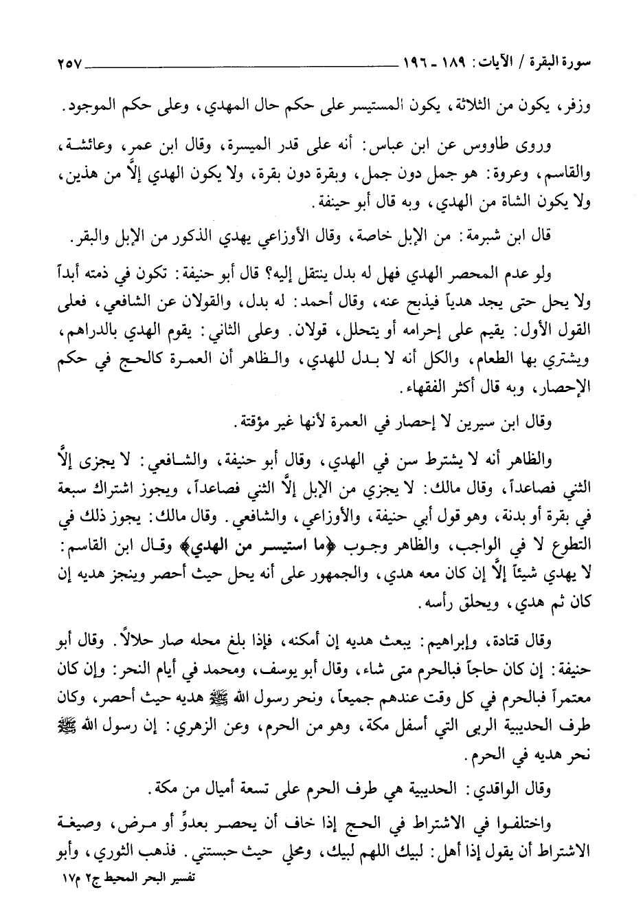 وَالظَّاهِرُ أَنَّهُ لَا يُشْتَرَطُ سِنٌّ فِي الْهَدْيِ، وَقَالَ أَبُو حَنِيفَةَ، وَالشَّافِعِيُّ: لَا يَجْزِي إِلَّا الثَّنِيُّ فَصَاعِدًا، وَقَالَ مَالِكٌ: لَا يَجْزِي مِنَ الْإِبِلِ إِلَّا الثَّنِيُّ فَصَاعِدًا، وَيَجُوزُ اشْتِرَاكُ سَبْعَةٍ فِي بَقَرَةٍ أَوْ بَدَنَةٍ، وَهُوَ قَوْلُ أَبِي حَنِيفَةَ، وَالْأَوْزَاعِيُّ، وَالشَّافِعِيُّ. وَقَالَ مَالِكٌ: يَجُوزُ ذَلِكَ فِي التَّطَوُّعِ لَا فِي الْوَاجِبِ، وَالظَّاهِرُ وُجُوبُ فَمَا اسْتَيْسَرَ مِنَ الْهَدْيِ وَقَالَ ابْنُ الْقَاسِمِ: