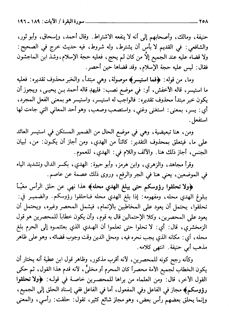 وَلا تَحْلِقُوا رُؤُسَكُمْ حَتَّى يَبْلُغَ الْهَدْيُ مَحِلَّهُ هَذَا نَهْيٌ عَنْ حَلْقِ الرَّأْسِ مُغَيًّا بِبُلُوغِ الْهَدْيِ مَحِلَّهُ، وَمَفْهُومُهُ: إِذَا بَلَغَ الهدي محله فاحلقوا رؤوسكم. وَالضَّمِيرُ فِي:
