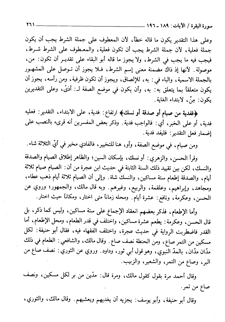 وَقَرَأَ الْحَسَنُ، وَالزُّهْرِيُّ: أَوْ نُسْكٍ، بِإِسْكَانِ السِّينِ وَالظَّاهِرُ إِطْلَاقُ الصِّيَامِ وَالصَّدَقَةِ وَالنُّسُكِ، لَكِنْ بَيَّنَ تَقْيِيدَ ذَلِكَ السُّنَّةُ الثَّابِتَةُ فِي حَدِيثِ ابْنِ عُجْرَةَ مِنْ أَنَّ: الصِّيَامَ صِيَامُ ثَلَاثَةِ أَيَّامٍ، وَالصَّدَقَةَ إِطْعَامُ سِتَّةِ مَسَاكِينَ، وَالنُّسُكَ شَاةٌ. وَإِلَى أَنَّ الصِّيَامَ ثَلَاثَةُ أَيَّامٍ ذَهَبَ عَطَاءٌ، وَمُجَاهِدٌ، وَإِبْرَاهِيمُ، وَعَلْقَمَةُ، وَالرَّبِيعُ، وَغَيْرُهُمْ. وَبِهِ قَالَ مَالِكٌ، وَالْجُمْهُورُ وَرُوِيَ عَنِ الْحَسَنِ، وَعِكْرِمَةَ، وَنَافِعٍ: عَشَرَةُ أَيَّامٍ. وَمَحِلُّهُ زَمَانًا مَتَى اخْتَارَ، وَمَكَانًا حَيْثُ اخْتَارَ.