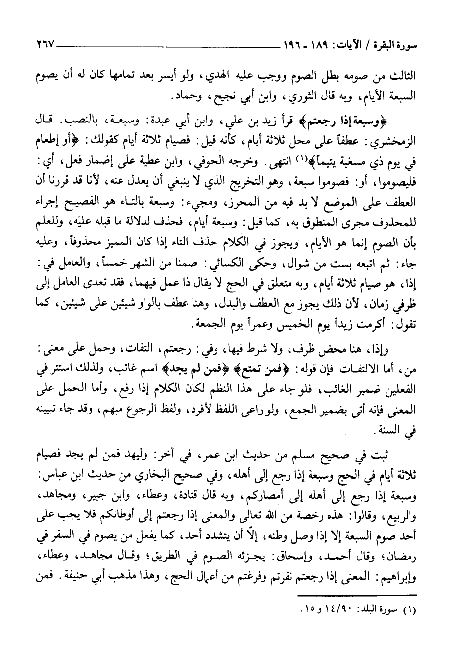 وَسَبْعَةٍ إِذا رَجَعْتُمْ قَرَأَ زَيْدُ بْنُ عَلِيٍّ، وَابْنُ أَبِي عَبْدَةَ: وَسَبْعَةً، بِالنَّصْبِ. قَالَ الزَّمَخْشَرِيُّ: عَطْفًا عَلَى مَحِلِّ ثَلَاثَةِ أَيَّامٍ، كَأَنَّهُ قِيلَ: فَصِيَامُ ثَلَاثَةِ أَيَّامٍ كَقَوْلِكَ: أَوْ إِطْعامٌ فِي يَوْمٍ ذِي مَسْغَبَةٍ يَتِيماً»