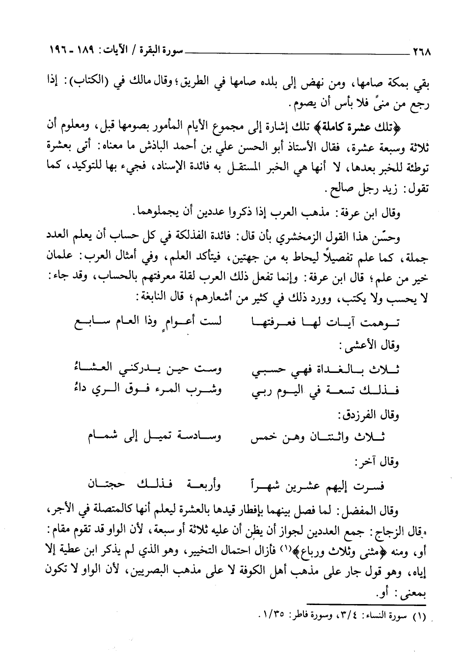 تِلْكَ عَشَرَةٌ كامِلَةٌ تِلْكَ إِشَارَةٌ إِلَى مَجْمُوعِ الْأَيَّامِ الْمَأْمُورِ بِصَوْمِهَا قَبْلُ، وَمَعْلُومٌ أَنَّ ثَلَاثَةً وَسَبْعَةً عَشَرَةٌ، فَقَالَ الْأُسْتَاذُ أَبُو الْحَسَنِ عَلِيُّ بْنُ أَحْمَدَ الْبَاذِشُ مَا مَعْنَاهُ: أَتَى بِعَشَرَةٍ تَوْطِئَةً لِلْخَبَرِ بَعْدَهَا، لَا أَنَّهَا هي الخبر المستقل بِهِ فَائِدَةَ الْإِسْنَادِ، فَجِيءَ بِهَا لِلتَّوْكِيدِ، كَمَا تَقُولُ: زَيْدٌ رَجُلٌ صَالِحٌ.