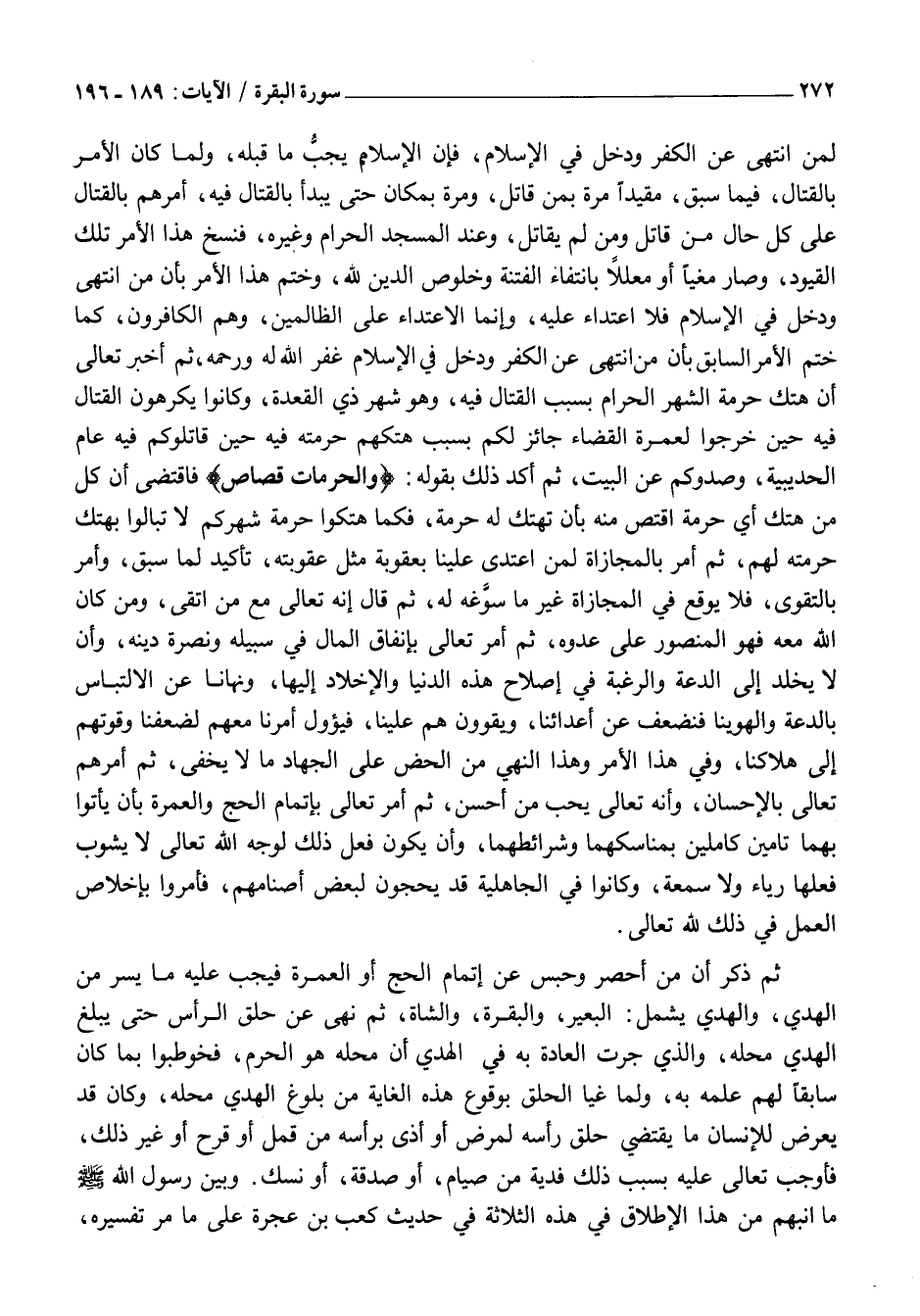 لِمَنِ انْتَهَى عَنِ الْكُفْرِ وَدَخَلَ فِي الْإِسْلَامِ، فَإِنَّ الْإِسْلَامَ يَجُبُّ مَا قَبْلَهُ، وَلَمَّا كَانَ الْأَمْرُ بِالْقِتَالِ، فِيمَا سَبَقَ، مُقَيَّدًا مَرَّةً بِمَنْ قَاتَلَ، وَمَرَّةً بِمَكَانٍ حَتَّى يُبْدَأَ بِالْقِتَالِ فِيهِ، أَمَرَهُمْ بِالْقِتَالِ عَلَى كُلِّ حَالٍ مَنْ قَاتَلَ وَمَنْ لَمْ يُقَاتِلْ، وَعِنْدَ الْمَسْجِدِ الْحَرَامِ وَغَيْرِهِ، فَنَسَخَ هَذَا الْأَمْرُ تِلْكَ الْقُيُودَ، وَصَارَ مُغَيًّا أَوْ مُعَلَّلًا بِانْتِفَاءِ الْفِتْنَةِ وَخُلُوصِ الدِّينِ لِلَّهِ، وَخَتَمَ هَذَا الْأَمْرَ بِأَنَّ مَنِ انْتَهَى وَدَخَلَ فِي الْإِسْلَامِ فَلَا اعْتِدَاءَ عَلَيْهِ، وَإِنَّمَا الِاعْتِدَاءُ عَلَى الظَّالِمِينَ، وَهُمُ الْكَافِرُونَ، كَمَا خَتَمَ الْأَمْرَ السَّابِقَ بِأَنَّ مَنِ انْتَهَى عَنِ الْكُفْرِ وَدَخَلَ فِي الْإِسْلَامِ غَفَرَ اللَّهُ لَهُ وَرَحِمَهُ، ثُمَّ أَخْبَرَ تَعَالَى أَنَّ هَتْكَ حُرْمَةِ الشَّهْرِ الْحَرَامِ بِسَبَبِ الْقِتَالِ فِيهِ، وَهُوَ شَهْرُ ذِي الْقَعْدَةِ، وَكَانُوا يَكْرَهُونَ الْقِتَالَ فِيهِ حِينَ خَرَجُوا لِعُمْرَةِ الْقَضَاءِ جَائِزٌ لَكُمْ بِسَبَبِ هَتْكِهِمْ حُرْمَتَهُ فِيهِ حِينَ قَاتَلُوكُمْ فِيهِ عَامَ الْحُدَيْبِيَةِ، وَصَدُّوكُمْ عَنِ الْبَيْتِ، ثُمَّ أَكَّدَ ذَلِكَ بِقَوْلِهِ: وَالْحُرُماتُ قِصاصٌ فَاقْتَضَى أَنَّ كُلَّ مَنْ هَتَكَ أَيَّ حُرْمَةٍ اقْتُصَّ مِنْهُ بِأَنْ تُهْتَكَ لَهُ حُرْمَةٌ، فَكَمَا هَتَكُوا حُرْمَةَ شَهْرِكُمْ لَا تُبَالُوا بِهَتْكِ حُرْمَتِهِ لَهُمْ، ثُمَّ أَمَرَ بِالْمُجَازَاةِ لِمَنِ اعْتَدَى عَلَيْنَا بِعُقُوبَةٍ مِثْلِ عُقُوبَتِهِ، تأكيد لِمَا سَبَقَ، وَأَمَرَ بِالتَّقْوَى، فَلَا يُوقِعُ فِي الْمُجَازَاةِ غَيْرَ مَا سَوَّغَهُ لَهُ، ثُمَّ قَالَ إِنَّهُ تَعَالَى مَعَ مَنِ اتَّقَى، وَمَنْ كَانَ اللَّهُ مَعَهُ فَهُوَ الْمَنْصُورُ عَلَى عَدُوِّهِ، ثُمَّ أَمَرَ تَعَالَى بِإِنْفَاقِ الْمَالِ فِي سَبِيلِهِ وَنُصْرَةِ دِينِهِ، وَأَنْ لَا يَخْلُدَ إِلَى الدَّعَةِ وَالرَّغْبَةِ فِي إِصْلَاحِ هَذِهِ الدُّنْيَا وَالْإِخْلَادِ إِلَيْهَا، وَنَهَانَا عَنِ الِالْتِبَاسِ بِالدَّعَةِ وَالْهُوَيْنَا فَنَضْعُفَ عَنْ أَعْدَائِنَا، ويقوون هم علينا، فيؤول أَمْرُنَا مَعَهُمْ لِضَعْفِنَا وَقُوَّتِهِمْ إِلَى هَلَاكِنَا، وَفِي هَذَا الْأَمْرِ وَهَذَا النَّهْيِ مِنَ الْحَضِّ عَلَى الْجِهَادِ مَا لَا يَخْفَى، ثُمَّ أَمَرَهُمْ تَعَالَى بِالْإِحْسَانِ، وَأَنَّهُ تَعَالَى يُحِبُّ مَنْ أَحْسَنَ، ثُمَّ أَمَرَ تَعَالَى بِإِتْمَامِ الْحَجِّ وَالْعُمْرَةِ بِأَنْ يَأْتُوا بِهِمَا تَامَّيْنِ كَامِلَيْنِ بِمَنَاسِكِهِمَا وَشَرَائِطِهِمَا، وَأَنْ يَكُونَ فِعْلُ ذَلِكَ لِوَجْهِ اللَّهِ تَعَالَى لَا يَشُوبُ فِعْلَهَا رِيَاءٌ وَلَا سُمْعَةٌ، وَكَانُوا فِي الْجَاهِلِيَّةِ قَدْ يَحُجُّونَ لِبَعْضِ أَصْنَامِهِمْ، فَأُمِرُوا بِإِخْلَاصِ الْعَمَلِ فِي ذَلِكَ لِلَّهِ تَعَالَى.