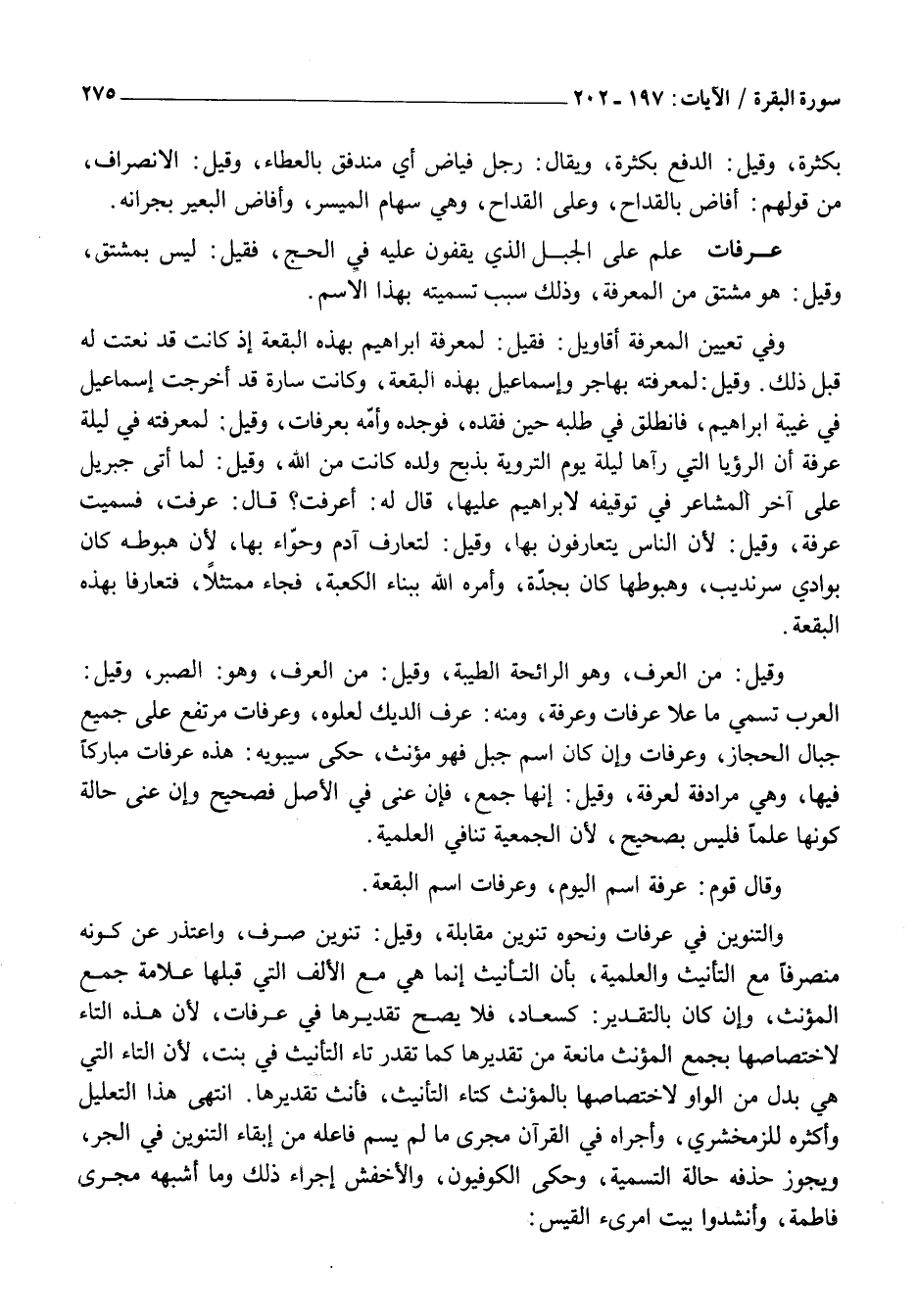 الْعَرَبُ تُسَمِّي مَا عَلَا عَرَفَاتٍ وَعَرَفَةَ، وَمِنْهُ: عُرْفُ الدِّيكِ لِعُلُوِّهِ، وَعَرَفَاتٌ مُرْتَفِعٌ عَلَى جَمِيعِ جِبَالِ الْحِجَازِ، وَعَرَفَاتٌ وَإِنْ كَانَ اسْمَ جَبَلٍ فَهُوَ مُؤَنَّثٌ، حَكَى سِيبَوَيْهِ: هَذِهِ عَرَفَاتٌ مُبَارَكًا فِيهَا، وَهِيَ مُرَادِفَةٌ لِعَرَفَةَ، وَقِيلَ: إِنَّهَا جَمْعٌ، فَإِنْ عَنَى فِي الْأَصْلِ فَصَحِيحٌ وَإِنْ عَنَى حَالَةَ كَوْنِهَا عَلَمًا فَلَيْسَ بِصَحِيحٍ، لِأَنَّ الْجَمْعِيَّةَ تُنَافِي الْعَلَمِيَّةَ.