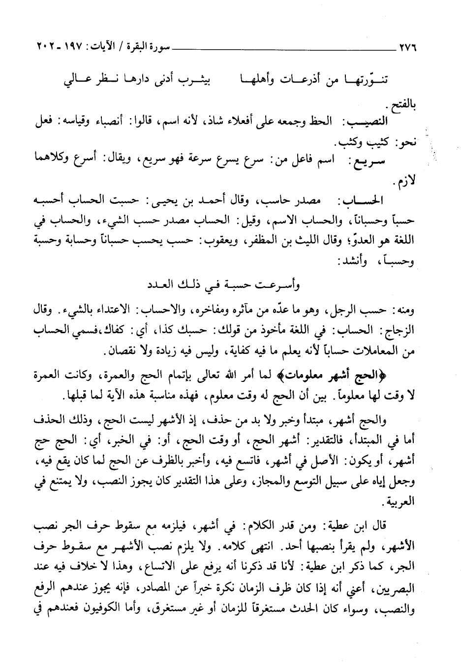 وَالْحَجُّ أَشْهُرٌ، مُبْتَدَأٌ وَخَبَرٌ وَلَا بُدَّ مِنْ حَذْفٍ، إِذِ الْأَشْهُرُ لَيْسَتِ الْحَجَّ، وَذَلِكَ الْحَذْفُ إِمَّا فِي الْمُبْتَدَأِ، فَالتَّقْدِيرُ: أَشْهُرُ الْحَجِّ، أَوْ وَقْتُ الْحَجِّ، أَوْ: فِي الْخَبَرِ، أَيِ: الْحَجُّ حَجُّ أَشْهُرٍ، أَوْ يَكُونُ: الْأَصْلُ فِي أَشْهُرٍ، فَاتَّسَعَ فِيهِ، وَأُخْبِرَ بِالظَّرْفِ عَنِ الْحَجِّ لَمَّا كَانَ يَقَعُ فِيهِ، وَجُعِلَ إِيَّاهُ عَلَى سَبِيلِ التَّوَسُّعِ وَالْمَجَازِ، وَعَلَى هَذَا التَّقْدِيرِ كَانَ يَجُوزُ النَّصْبُ، وَلَا يَمْتَنِعُ فِي الْعَرَبِيَّةِ.