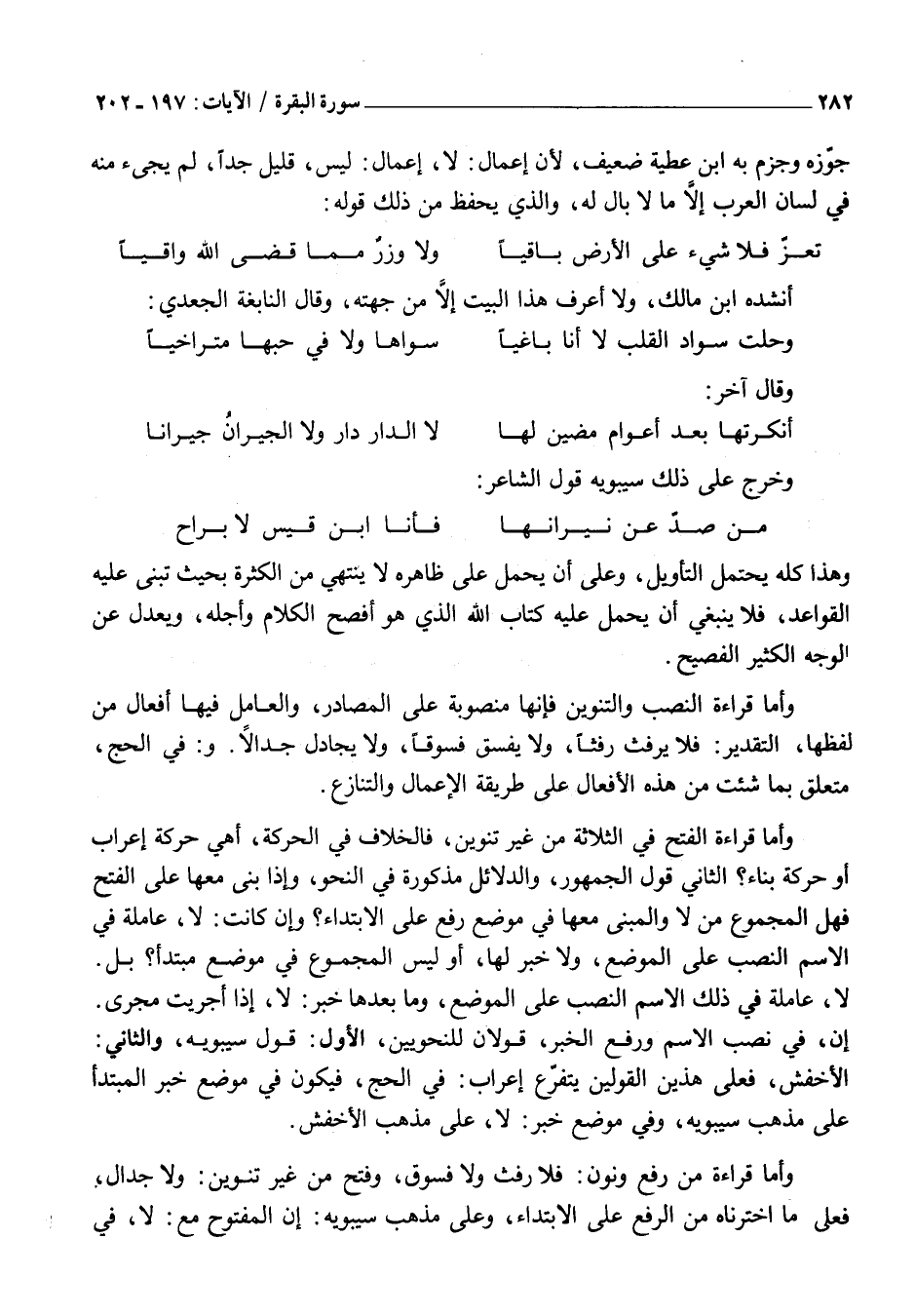 وَأَمَّا قِرَاءَةُ النَّصْبِ وَالتَّنْوِينِ فَإِنَّهَا مَنْصُوبَةٌ عَلَى الْمَصَادِرِ، وَالْعَامِلُ فِيهَا أَفْعَالٌ مِنْ لَفْظِهَا، التَّقْدِيرُ: فَلَا يَرْفُثُ رَفَثًا، وَلَا يَفْسُقُ فُسُوقًا، وَلَا يُجَادِلُ جِدَالًا. وَ: فِي الْحَجِّ، مُتَعَلِّقٌ بِمَا شِئْتَ مِنْ هَذِهِ الْأَفْعَالِ عَلَى طَرِيقَةِ الْإِعْمَالِ وَالتَّنَازُعِ.