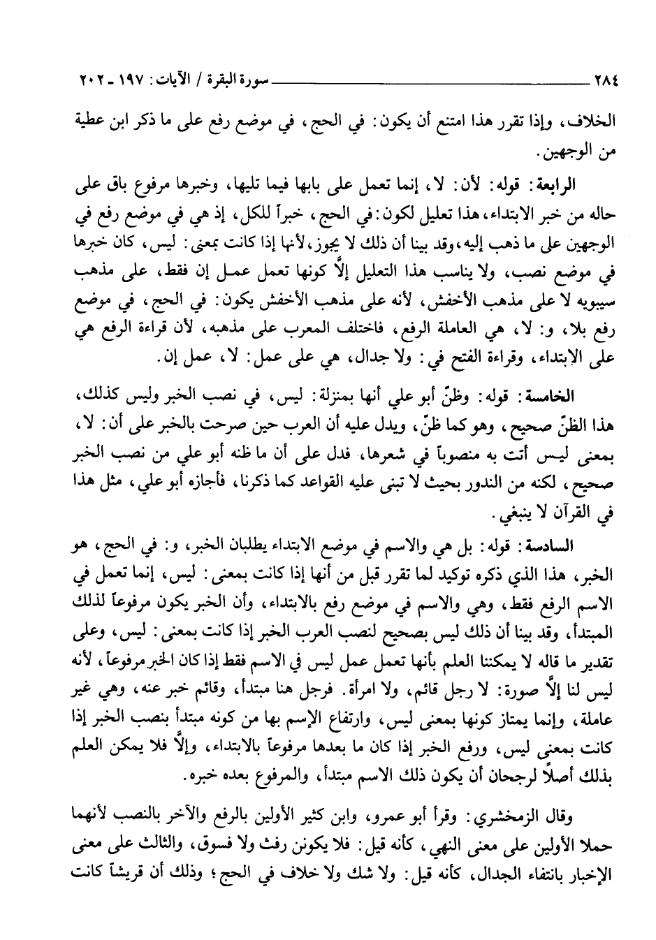 الرَّابِعَةُ: قَوْلُهُ: لِأَنَّ: لَا، إِنَّمَا تَعْمَلُ عَلَى بَابِهَا فِيمَا تَلِيهَا، وَخَبَرُهَا مَرْفُوعٌ بَاقٍ عَلَى حَالِهِ مِنْ خَبَرِ الِابْتِدَاءِ، هَذَا تَعْلِيلٌ لِكَوْنِ: فِي الْحَجِّ، خَبَرًا لِلْكُلِّ، إِذْ هِيَ فِي مَوْضِعِ رَفْعٍ فِي الْوَجْهَيْنِ عَلَى مَا ذَهَبَ إِلَيْهِ، وَقَدْ بَيَّنَّا أَنَّ ذَلِكَ لَا يَجُوزُ، لِأَنَّهَا إِذَا كَانَتْ بِمَعْنَى: لَيْسَ، كَانَ خَبَرُهَا فِي مَوْضِعِ نَصْبٍ، وَلَا يُنَاسِبُ هَذَا التَّعْلِيلَ إِلَّا كَوْنُهَا تَعْمَلُ عَمَلَ إِنَّ فَقَطْ، عَلَى مَذْهَبِ سِيبَوَيْهِ لَا عَلَى مَذْهَبِ الْأَخْفَشِ، لِأَنَّهُ عَلَى مَذْهَبِ الْأَخْفَشِ يَكُونُ: فِي الْحَجِّ، في موضع رفع بلا، وَ: لَا، هِيَ الْعَامِلَةُ الرَّفْعَ، فَاخْتَلَفَ الْمُعْرِبُ عَلَى مَذْهَبِهِ، لِأَنَّ قِرَاءَةَ الرَّفْعِ هِيَ عَلَى الِابْتِدَاءِ، وَقِرَاءَةَ الْفَتْحِ فِي: وَلَا جِدَالَ، هِيَ عَلَى عَمَلِ: لَا، عَمَلَ إِنَّ.