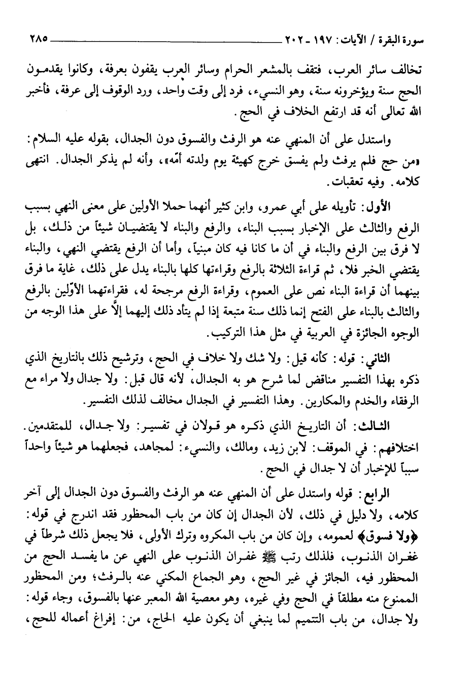 الثَّانِي: قَوْلُهُ: كَأَنَّهُ قِيلَ: وَلَا شَكَّ وَلَا خِلَافَ فِي الْحَجِّ، وَتَرْشِيحُ ذَلِكَ بِالتَّارِيخِ الَّذِي ذَكَرَهُ بِهَذَا التَّفْسِيرِ مُنَاقِضٌ لِمَا شَرَحَ هُوَ بِهِ الْجِدَالَ، لِأَنَّهُ قَالَ قَبْلُ: وَلَا جِدَالَ وَلَا مِرَاءَ مَعَ الرُّفَقَاءِ وَالْخَدَمِ وَالْمُكَارِينَ. وَهَذَا التَّفْسِيرُ فِي الْجِدَالِ مُخَالِفٌ لِذَلِكَ التَّفْسِيرِ.