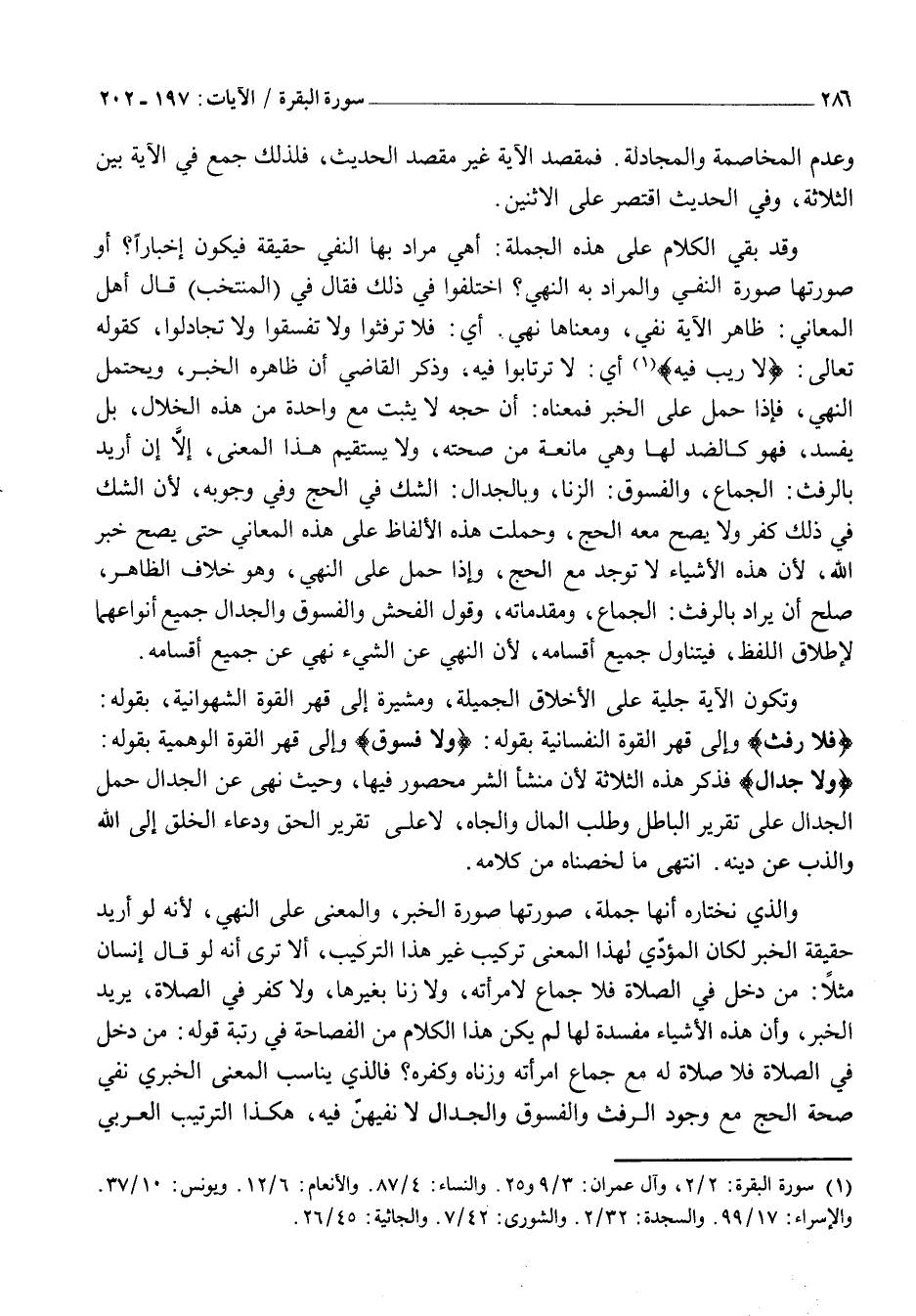 وَقَدْ بَقِيَ الْكَلَامُ عَلَى هَذِهِ الْجُمْلَةِ: أَهِيَ مُرَادٌ بِهَا النَّفْيُ حَقِيقَةً فَيَكُونُ إِخْبَارًا؟ أَوْ صُورَتُهَا صُورَةُ النَّفْيِ وَالْمُرَادُ بِهِ النَّهْيُ؟ اخْتَلَفُوا فِي ذَلِكَ فَقَالَ فِي (الْمُنْتَخَبِ) قَالَ أَهْلُ الْمَعَانِي: ظَاهِرُ الْآيَةِ نَفْيٌ، وَمَعْنَاهَا نَهْيٌ. أَيْ: فَلَا تَرْفُثُوا وَلَا تَفْسُقُوا وَلَا تُجَادِلُوا، كَقَوْلِهِ تَعَالَى: لَا رَيْبَ فِيهِ «1» أَيْ: لَا تَرْتَابُوا فِيهِ، وَذَكَرَ الْقَاضِي أَنَّ ظَاهِرَهُ الْخَبَرُ، وَيَحْتَمِلُ النَّهْيَ، فَإِذَا حُمِلَ عَلَى الْخَبَرِ فَمَعْنَاهُ: أَنَّ حَجَّهُ لَا يَثْبُتُ مَعَ وَاحِدَةٍ مِنْ هَذِهِ الْخِلَالِ، بَلْ يَفْسُدُ، فَهُوَ كَالضِّدِّ لَهَا وَهِيَ مَانِعَةٌ مِنْ صِحَّتِهِ، وَلَا يَسْتَقِيمُ هَذَا الْمَعْنَى، إِلَّا إِنْ أُرِيدَ بِالرَّفَثِ: الْجِمَاعُ، وَالْفُسُوقِ: الزِّنَا، وَبِالْجِدَالِ: الشَّكُّ فِي الْحَجِّ وَفِي وُجُوبِهِ، لِأَنَّ الشَّكَّ فِي ذَلِكَ كُفْرٌ وَلَا يَصِحُّ مَعَهُ الْحَجُّ، وَحُمِلَتْ هَذِهِ الْأَلْفَاظُ عَلَى هَذِهِ الْمَعَانِي حَتَّى يَصِحَّ خَبَرُ اللَّهِ، لِأَنَّ هَذِهِ الْأَشْيَاءَ لَا تُوجَدُ مَعَ الْحَجِّ، وَإِذَا حُمِلَ عَلَى النَّهْيِ، وَهُوَ خِلَافُ الظَّاهِرِ، صَلُحَ أَنْ يُرَادَ بِالرَّفَثِ: الْجِمَاعُ، وَمُقَدِّمَاتُهُ، وَقَوْلُ الْفُحْشِ وَالْفُسُوقِ وَالْجِدَالِ جَمِيعُ أنواعهما لِإِطْلَاقِ اللَّفْظِ، فَيَتَنَاوَلُ جَمِيعَ أَقْسَامِهِ، لِأَنَّ النَّهْيَ عَنِ الشَّيْءِ نَهْيٌ عَنْ جَمِيعِ أَقْسَامِهِ.