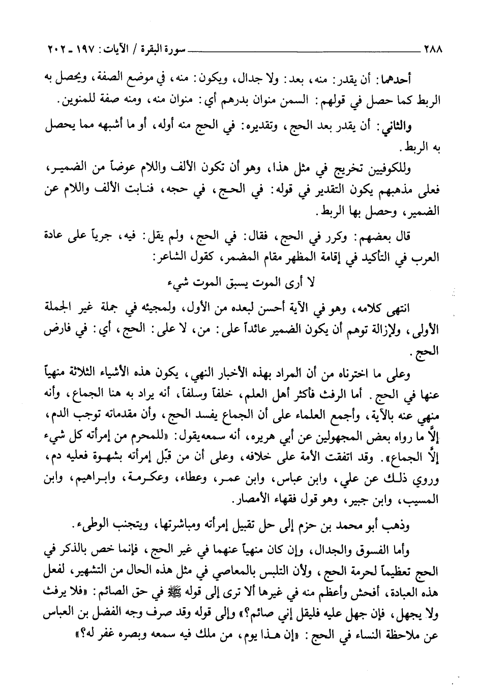 لَا أَرَى الْمَوْتَ يَسْبِقُ الْمَوْتَ شَيْءٌ انْتَهَى كَلَامُهُ، وَهُوَ فِي الْآيَةِ أَحْسَنُ لِبُعْدِهِ مِنَ الْأَوَّلِ، وَلِمَجِيئِهِ فِي جُمْلَةٍ غَيْرِ الْجُمْلَةِ الْأُولَى، وَلِإِزَالَةِ تَوَهُّمِ أَنْ يَكُونَ الضَّمِيرُ عَائِدًا عَلَى: مَنْ، لَا عَلَى: الْحَجِّ، أَيْ: فِي فَارِضِ الْحَجِّ.