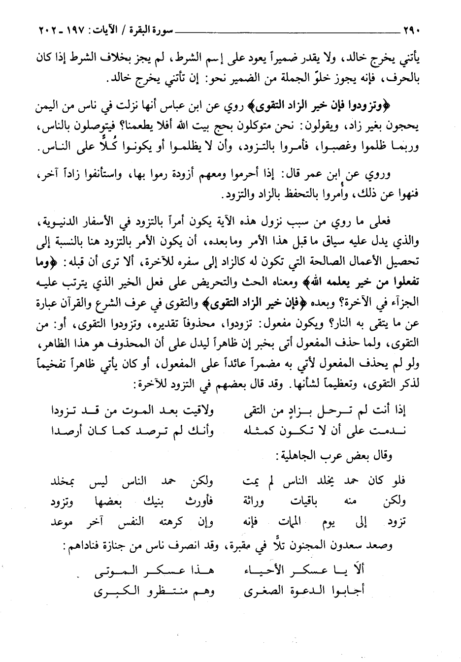 وَتَزَوَّدُوا فَإِنَّ خَيْرَ الزَّادِ التَّقْوى رُوِيَ عَنِ ابْنِ عَبَّاسٍ أَنَّهَا نَزَلَتْ فِي نَاسٍ مِنَ الْيَمَنِ يَحُجُّونَ بِغَيْرِ زَادٍ، وَيَقُولُونَ: نَحْنُ مُتَوَكِّلُونَ بِحَجِّ بَيْتِ اللَّهِ أَفَلَا يُطْعِمُنَا؟ فَيَتَوَصَّلُونَ بِالنَّاسِ، وَرُبَّمَا ظَلَمُوا وَغَصَبُوا، فَأُمِرُوا بِالتَّزَوُّدِ، وَأَنْ لَا يَظْلِمُوا أَوْ يَكُونُوا كَلًّا عَلَى النَّاسِ.