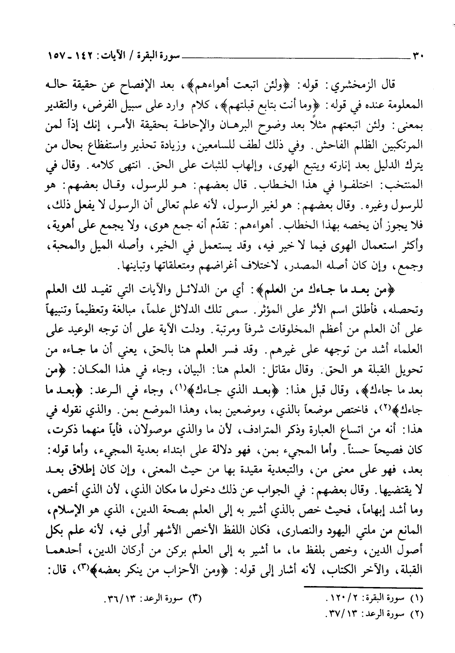 بَعْدَ، فَهُوَ عَلَى مَعْنَى مِنْ، وَالتَّبْعَدِيَّةُ مُقَيَّدَةٌ بِهَا مِنْ حَيْثُ الْمَعْنَى، وَإِنْ كَانَ إِطْلَاقُ بَعْدَ لَا يَقْتَضِيهَا. وَقَالَ بَعْضُهُمْ: فِي الْجَوَابِ عَنْ ذَلِكَ دُخُولُ مَا مَكَانَ الَّذِي، لِأَنَّ الَّذِي أَخَصُّ، وَمَا أَشَدُّ إِبْهَامًا، فَحَيْثُ خَصَّ بِالَّذِي أُشِيرُ بِهِ إِلَى الْعِلْمِ بِصِحَّةِ الدين، الذي هو الإسلام، الْمَانِعُ مِنْ مِلَّتِي الْيَهُودِ وَالنَّصَارَى، فَكَانَ اللَّفْظُ الْأَخَصُّ الْأَشْهَرُ أَوْلَى فِيهِ، لِأَنَّهُ عِلْمٌ بِكُلِّ أُصُولِ الدِّينِ، وَخَصَّ بِلَفْظِ مَا، مَا أشير به إلى العلم بِرُكْنٍ مِنْ أَرْكَانِ الدِّينِ، أَحَدُهُمَا الْقِبْلَةُ، وَالْآخَرُ الْكِتَابُ، لِأَنَّهُ أَشَارَ إِلَى قَوْلِهِ: وَمِنَ الْأَحْزابِ مَنْ يُنْكِرُ بَعْضَهُ «3» ، قال: