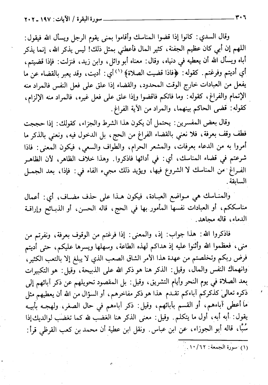 اللَّهُمَّ إِنَّ أَبِي كَانَ عَظِيمَ الْجَفْنَةِ، كَثِيرَ الْمَالِ فَأَعْطِنِي بِمِثْلِ ذَلِكَ! لَيْسَ يَذْكُرُ اللَّهَ، إِنَّمَا يَذْكُرُ أَبَاهُ وَيَسْأَلُ اللَّهَ أَنْ يُعْطِيَهُ فِي دُنْيَاهُ، وَقَالَ: مَعْنَاهُ أَبُو وَائِلٍ، وَابْنُ زَيْدٍ، فَنَزَلَتْ: فَإِذَا قَضَيْتُمْ، أَيْ أَدَّيْتُمْ وَفَرَغْتُمْ. كَقَوْلِهِ: فَإِذا قُضِيَتِ الصَّلاةُ «1» أَيْ: أُدِّيَتْ، وَقَدْ يُعَبَّرُ بِالْقَضَاءِ عَنْ مَا يُفْعَلُ مِنَ الْعِبَادَاتِ خَارِجَ الْوَقْتِ الْمَحْدُودِ، وَالْقَضَاءُ إِذَا عُلِّقَ عَلَى فِعْلِ النَّفْسِ فَالْمُرَادُ مِنْهُ الْإِتْمَامُ وَالْفَرَاغُ، كَقَوْلِهِ: وَمَا فَاتَكُمْ فَاقْضُوا وَإِذَا عُلِّقَ عَلَى فِعْلِ غَيْرِهِ، فَالْمُرَادُ مِنْهُ الْإِلْزَامُ، كَقَوْلِهِ: قَضَى الْحَاكِمُ بَيْنَهُمَا، وَالْمُرَادُ مِنَ الْآيَةِ الْفَرَاغُ.