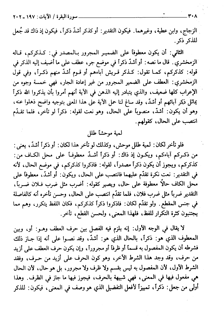الثَّانِي: أَنْ يَكُونَ مَعْطُوفًا عَلَى الضَّمِيرِ الْمَجْرُورِ بِالْمَصْدَرِ فِي: كَذِكْرِكُمْ، قَالَهُ الزَّمَخْشَرِيُّ. قَالَ مَا نَصُّهُ: أَوْ أَشَدَّ ذِكْرًا فِي مَوْضِعِ جَرٍّ، عُطِفَ عَلَى مَا أُضِيفَ إِلَيْهِ الذِّكْرُ فِي قَوْلِهِ: كَذِكْرِكُمْ، كَمَا تَقُولُ: كَذِكْرِ قُرَيْشٍ آبَاءَهُمْ أَوْ قَوْمٍ أَشَدِّ مِنْهُمْ ذِكْرًا، وَفِي قَوْلِ الزَّمَخْشَرِيِّ: الْعَطْفُ عَلَى الضَّمِيرِ الْمَجْرُورِ مِنْ غَيْرِ إِعَادَةِ الْجَارِّ، فَهِيَ خَمْسَةُ وُجُوهٍ مِنَ الْإِعْرَابِ كُلُّهَا ضَعِيفٌ، وَالَّذِي يَتَبَادَرُ إِلَيْهِ الذِّهْنُ فِي الْآيَةِ أَنَّهُمْ أُمِرُوا بِأَنْ يَذْكُرُوا اللَّهَ ذِكْرًا يُمَاثِلُ ذكر آبَائَهُمْ أَوْ أَشُدَّ، وَقَدْ سَاغَ لَنَا حَمْلُ الْآيَةِ عَلَى هَذَا الْمَعْنَى بِتَوْجِيهٍ وَاضِحٍ ذَهَلُوا عَنْهُ، وَهُوَ أَنْ يَكُونَ: أَشَدَّ، مَنْصُوبًا عَلَى الْحَالِ، وَهُوَ نَعْتٌ لِقَوْلِهِ: ذِكْرًا لَوْ تَأَخَّرَ، فَلَمَّا تَقَدَّمَ انْتَصَبَ عَلَى الْحَالِ، كَقَوْلِهِمْ.