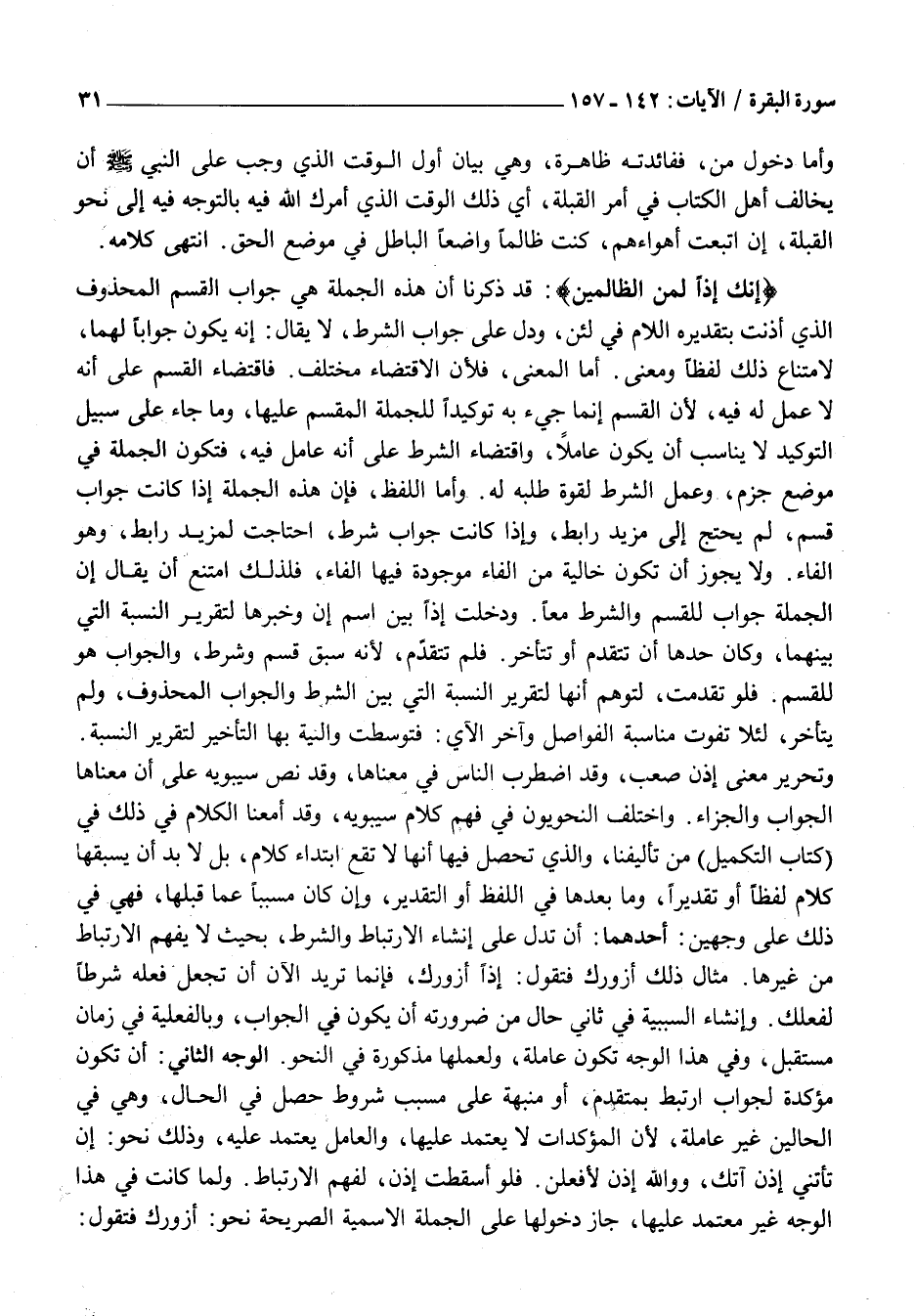 وَأَمَّا دُخُولُ مِنْ، فَفَائِدَتُهُ ظَاهِرَةٌ، وَهِيَ بَيَانُ أَوَّلِ الْوَقْتِ الَّذِي وَجَبَ عَلَى النَّبِيِّ صَلَّى اللَّهُ عليه وَسَلَّمَ أَنْ يُخَالِفَ أَهْلَ الْكِتَابِ فِي أَمْرِ الْقِبْلَةِ، أَيْ ذَلِكَ الْوَقْتُ الَّذِي أَمَرَكَ اللَّهُ فِيهِ بِالتَّوَجُّهِ فِيهِ إِلَى نَحْوِ الْقِبْلَةِ، إِنِ اتَّبَعْتَ أَهْوَاءَهُمْ، كُنْتَ ظَالِمًا وَاضِعًا الْبَاطِلَ فِي مَوْضِعِ الْحَقِّ. انْتَهَى كَلَامُهُ.