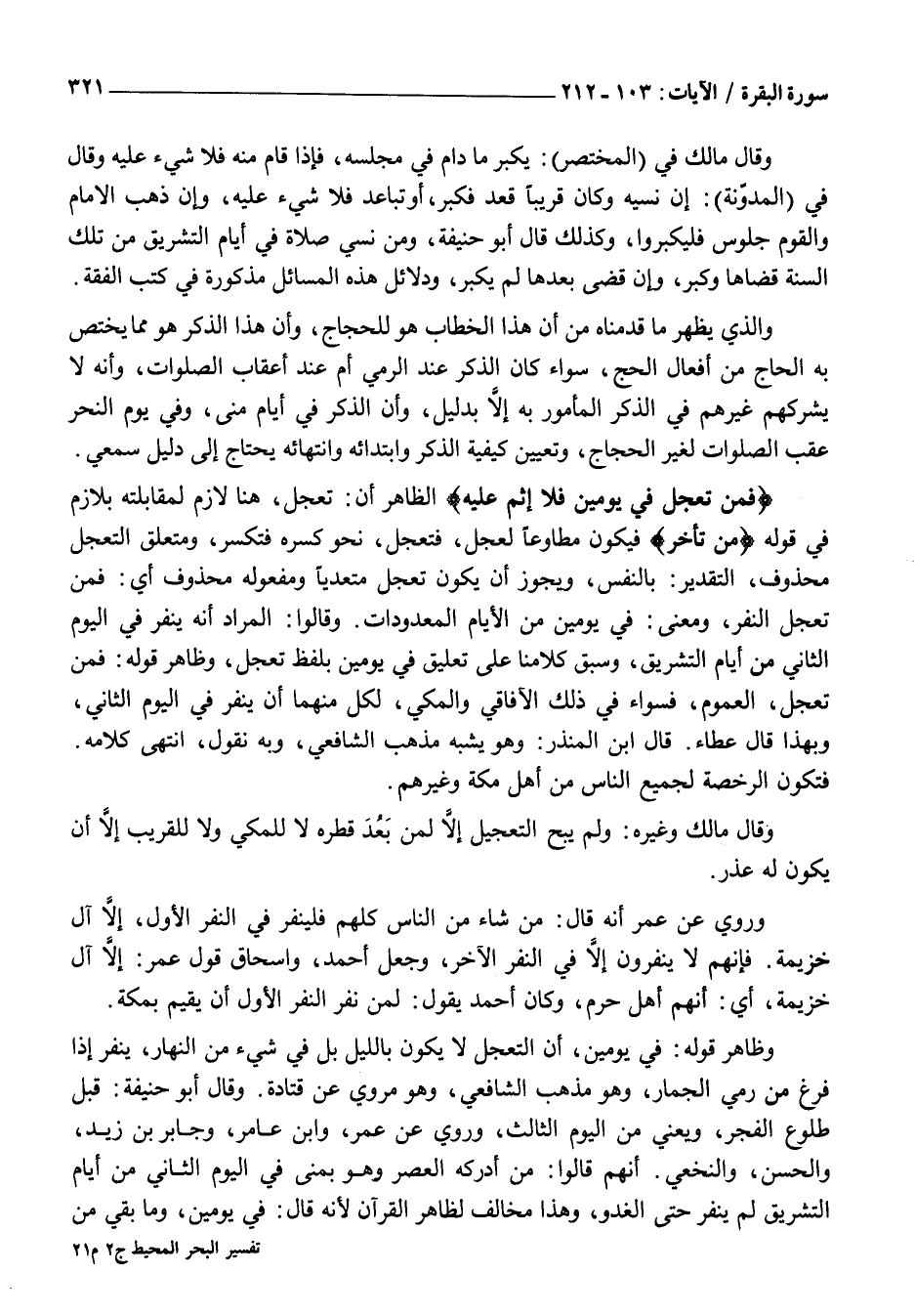 فَمَنْ تَعَجَّلَ فِي يَوْمَيْنِ فَلا إِثْمَ عَلَيْهِ الظَّاهِرُ أَنَّ: تَعَجَّلَ، هُنَا لَازِمٌ لِمُقَابَلَتِهِ بِلَازِمٍ فِي قَوْلِهِ مَنْ تَأَخَّرَ فَيَكُونُ مُطَاوِعًا لِعَجِلَ، فَتَعَجَّلَ، نَحْوَ كَسَرَهُ فَتَكَسَّرَ، وَمُتَعَلَّقُ التَّعَجُّلِ مَحْذُوفٌ، التَّقْدِيرُ: بِالنَّفْسِ، وَيَجُوزُ أَنْ يَكُونَ تَعَجَّلَ مُتَعَدِّيًا وَمَفْعُولُهُ مَحْذُوفٌ أَيْ: فَمَنْ تَعَجَّلَ النَّفْرَ، وَمَعْنَى: فِي يَوْمَيْنِ مِنَ الْأَيَّامِ الْمَعْدُودَاتِ. وَقَالُوا: الْمُرَادُ أَنَّهُ ينفر فِي الْيَوْمِ الثَّانِي مِنْ أَيَّامِ التَّشْرِيقِ، وَسَبَقَ كَلَامُنَا عَلَى تَعْلِيقِ فِي يَوْمَيْنِ بِلَفْظِ تَعَجَّلَ، وَظَاهِرُ قَوْلِهِ: فَمَنْ تَعَجَّلَ، الْعُمُومُ، فَسَوَاءٌ فِي ذَلِكَ الْآفَاقِيِّ وَالْمَكِّيُّ، لِكُلٍّ مِنْهُمَا أَنْ ينفر في اليوم الثاني، وَبِهَذَا قَالَ عَطَاءٌ. قَالَ ابْنُ الْمُنْذِرِ: وَهُوَ يُشْبِهُ مَذْهَبَ الشَّافِعِيِّ، وَبِهِ نَقُولُ، انْتَهَى كَلَامُهُ.