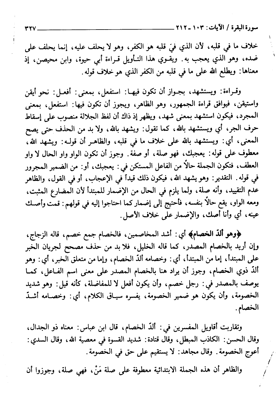 وَهُوَ أَلَدُّ الْخِصامِ أَيْ: أَشَدُّ الْمُخَاصِمِينَ، فَالْخِصَامُ جَمْعُ خَصْمٍ، قَالَهُ الزَّجَّاجُ، وَإِنْ أُرِيدَ بِالْخِصَامِ الْمَصْدَرُ، كَمَا قَالَهُ الْخَلِيلُ، فَلَا بُدَّ مِنْ حَذْفٍ مُصَحِّحٍ لِجَرَيَانِ الْخَبَرِ عَلَى الْمُبْتَدَأِ، إِمَّا مِنَ الْمُبْتَدَأِ، أَيْ: وَخِصَامُهُ أَلَدُّ الْخِصَامِ، وَإِمَّا مِنْ مُتَعَلَّقِ الْخَبَرِ، أَيْ: وَهُوَ أَلَدُّ ذَوِي الْخِصَامِ، وَجَوَّزَ أَنْ يُرَادَ هُنَا بِالْخِصَامِ الْمَصْدَرُ عَلَى مَعْنَى اسْمِ الْفَاعِلِ، كَمَا يُوصَفُ بِالْمَصْدَرِ فِي: رَجُلٍ خَصِمٍ، وَأَنْ يَكُونَ أَفْعَلُ لَا لِلْمُفَاضَلَةِ، كَأَنَّهُ قِيلَ: وَهُوَ شَدِيدُ الْخُصُومَةِ، وَأَنْ يَكُونَ هُوَ ضَمِيرَ الْخُصُومَةِ، يُفَسِّرُهُ سِيَاقُ الْكَلَامِ، أَيْ: وَخِصَامُهُ أَشَدُّ الْخِصَامِ.