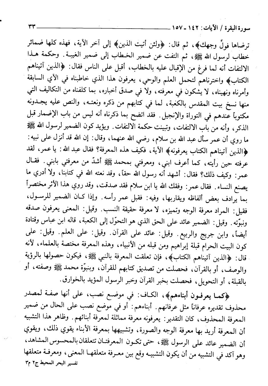الَّذِينَ آتَيْناهُمُ الْكِتابَ يَعْرِفُونَهُ الْآيَةَ، فَكَيْفَ هَذِهِ الْمَعْرِفَةُ؟ فَقَالَ عَبْدُ اللَّهِ: يَا عُمَرُ، لَقَدْ عَرَفْتُهُ حِينَ رَأَيْتُهُ، كَمَا أَعْرِفُ ابْنِي، وَمَعْرِفَتِي بِمُحَمَّدٍ صَلَّى اللَّهُ عَلَيْهِ وَسَلَّمَ أَشَدُّ مِنْ مَعْرِفَتِي بِابْنِي. فَقَالَ عُمَرُ: وَكَيْفَ ذَلِكَ؟ فَقَالَ: أَشْهَدُ أَنَّهُ رَسُولُ اللَّهِ حَقًّا، وَقَدْ نَعَتَهُ اللَّهُ فِي كِتَابِنَا، وَلَا أَدْرِي مَا يَصْنَعُ النِّسَاءُ. فَقَالَ عُمَرُ: وَفَّقَكَ اللَّهُ يَا ابْنَ سَلَامٍ فَقَدْ صَدَقْتَ، وَقَدْ رُوِيَ هَذَا الْأَثَرُ مُخْتَصَرًا بِمَا يُرَادِفُ بَعْضَ أَلْفَاظِهِ وَيُقَارِبُهَا، وَفِيهِ: فَقَبَّلَ عُمَرُ رَأَسَهُ. وَإِذَا كَانَ الضَّمِيرُ لِلرَّسُولِ، فَقِيلَ: الْمُرَادُ مَعْرِفَةُ الْوَجْهِ وَتَمَيُّزِهِ، لَا مَعْرِفَةُ حَقِيقَةِ النَّسَبِ. وَقِيلَ: الْمَعْنَى يَعْرِفُونَ صِدْقَهُ وَنُبُوَّتَهُ. وَقِيلَ: الضَّمِيرُ عَائِدٌ عَلَى الْحَقِّ الَّذِي هُوَ التَّحَوُّلُ إِلَى الْكَعْبَةِ، قَالَهُ ابْنُ عَبَّاسٍ وَقَتَادَةُ أَيْضًا، وَابْنُ جُرَيْجٍ وَالرَّبِيعُ. وَقِيلَ: عَائِدٌ عَلَى الْقُرْآنِ. وَقِيلَ: عَلَى الْعِلْمِ. وَقِيلَ: عَلَى كَوْنِ الْبَيْتِ الْحَرَامِ قِبْلَةَ إِبْرَاهِيمَ وَمَنْ قَبْلَهُ مِنَ الْأَنْبِيَاءِ، وَهَذِهِ الْمَعْرِفَةُ مُخْتَصَّةٌ بِالْعُلَمَاءِ، لِأَنَّهُ قَالَ: الَّذِينَ آتَيْناهُمُ الْكِتابَ، فَإِنْ تَعَلَّقَتِ الْمَعْرِفَةُ بِالنَّبِيِّ صَلَّى اللَّهُ عَلَيْهِ وَسَلَّمَ، فَيَكُونُ حُصُولُهَا بِالرُّؤْيَةِ وَالْوَصْفِ، أَوْ بِالْقُرْآنِ، فَحَصَلَتْ مِنْ تَصْدِيقِ كِتَابِهِمْ لِلْقُرْآنِ، وَبِنُبُوَّةِ مُحَمَّدٍ صَلَّى اللَّهُ عَلَيْهِ وَسَلَّمَ وَصَفَتِهِ، أَوْ بِالْقِبْلَةِ، أَوِ التَّحْوِيلِ، فَحَصَلَتْ بِخَبَرِ الْقُرْآنِ وَخَبَرِ الرَّسُولِ الْمُؤَيَّدِ بِالْخَوَارِقِ.