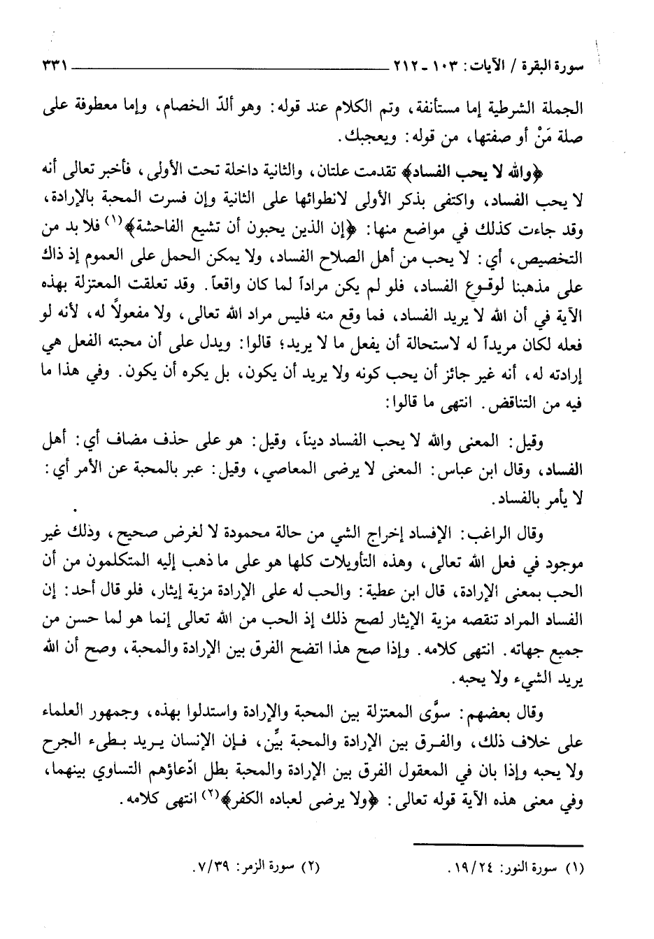 وَقَالَ الرَّاغِبُ: الْإِفْسَادُ إِخْرَاجُ الشَّيْءِ مِنْ حَالَةٍ مَحْمُودَةٍ لَا لِغَرَضٍ صَحِيحٍ، وَذَلِكَ غَيْرُ مَوْجُودٍ فِي فِعْلِ اللَّهِ تَعَالَى، وَهَذِهِ التَّأْوِيلَاتُ كُلُّهَا هُوَ عَلَى مَا ذَهَبَ إِلَيْهِ الْمُتَكَلِّمُونَ مِنْ أَنَّ الْحُبَّ بِمَعْنَى الْإِرَادَةِ، قَالَ ابْنُ عَطِيَّةَ: وَالْحُبُّ لَهُ عَلَى الْإِرَادَةِ مَزِيَّةُ إِيثَارٍ، فَلَوْ قَالَ أَحَدٌ: إِنَّ الْفَسَادَ الْمُرَادَ تَنْقُصُهُ مَزِيَّةُ الْإِيثَارِ لَصَحَّ ذَلِكَ إِذِ الْحُبُّ مِنَ اللَّهِ تَعَالَى إِنَّمَا هُوَ لِمَا حَسُنَ مِنْ جَمِيعِ جِهَاتِهِ. انْتَهَى كَلَامُهُ. وَإِذَا صَحَّ هَذَا اتَّضَحَ الْفَرْقُ بَيْنَ الْإِرَادَةِ وَالْمَحَبَّةِ، وَصَحَّ أَنَّ اللَّهَ يُرِيدُ الشَّيْءَ وَلَا يُحِبُّهُ.