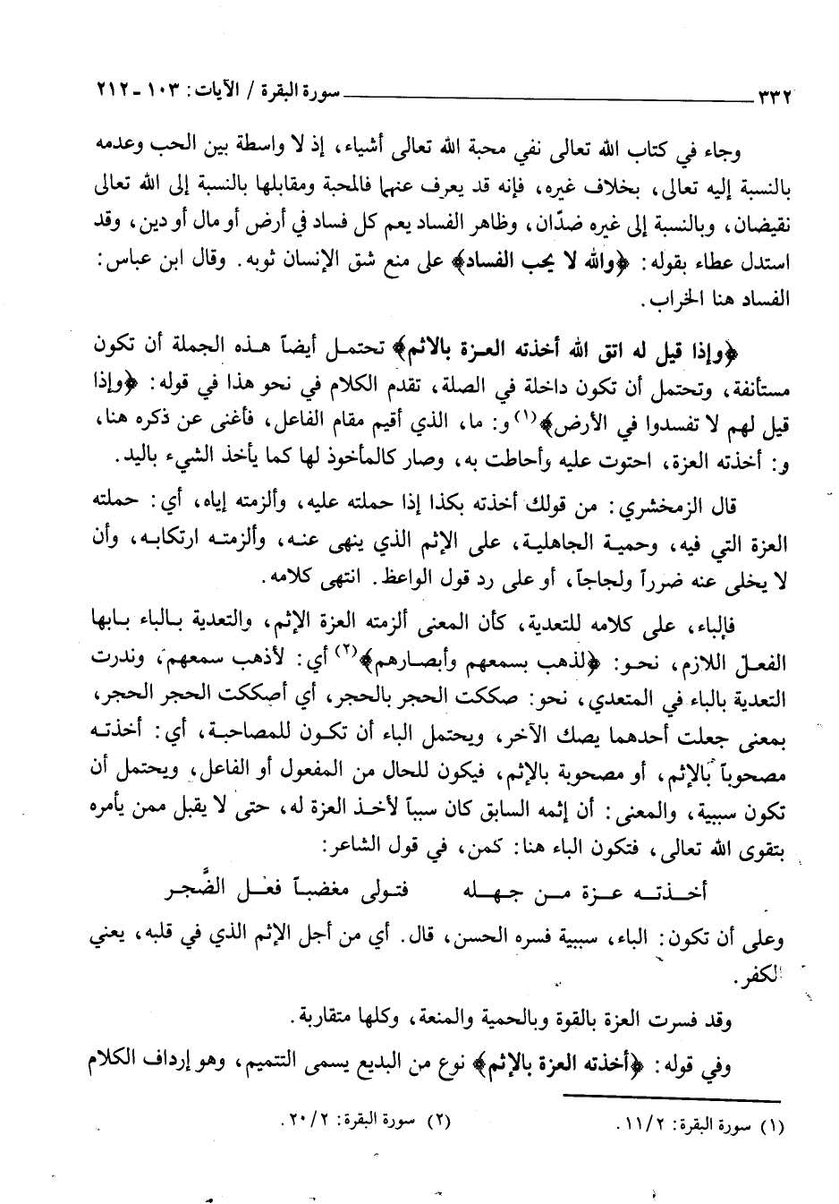 فَالْبَاءُ، عَلَى كَلَامِهِ لِلتَّعْدِيَةِ، كَأَنَّ الْمَعْنَى أَلْزَمَتْهُ الْعِزَّةُ الْإِثْمَ، وَالتَّعْدِيَةُ بِالْبَاءِ بَابُهَا الْفِعْلِ اللَّازِمِ، نَحْوَ: لَذَهَبَ بِسَمْعِهِمْ وَأَبْصارِهِمْ «2» أَيْ: لَأَذْهَبَ سَمْعَهُمْ، وَنَدَرَتِ التَّعْدِيَةُ بِالْبَاءِ فِي الْمُتَعَدِّي، نَحْوَ: صَكِكْتُ الْحَجَرَ بِالْحَجَرِ، أَيْ أَصْكَكْتُ الْحَجَرَ الْحَجَرِ، بِمَعْنَى جَعَلْتُ أَحَدَهُمَا يَصُكُّ الْآخَرَ، وَيَحْتَمِلُ الْبَاءُ أَنْ تَكُونَ لِلْمُصَاحَبَةِ، أَيْ: أَخَذَتْهُ مَصْحُوبًا بِالْإِثْمِ، أَوْ مَصْحُوبَةً بِالْإِثْمِ، فَيَكُونُ لِلْحَالِ مِنَ الْمَفْعُولِ أَوِ الْفَاعِلِ، وَيَحْتَمِلُ أَنْ تَكُونَ سَبَبِيَّةً، وَالْمَعْنَى: أَنَّ إِثْمَهُ السَّابِقَ كَانَ سَبَبًا لِأَخْذِ الْعِزَّةِ لَهُ، حَتَّى لَا يَقْبَلَ مِمَّنْ يَأْمُرُهُ بِتَقْوَى اللَّهِ تَعَالَى، فَتَكُونُ الْبَاءُ هُنَا: كَمِنْ، فِي قَوْلِ الشَّاعِرِ: