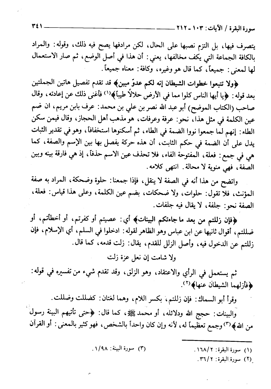 وَلا تَتَّبِعُوا خُطُواتِ الشَّيْطانِ إِنَّهُ لَكُمْ عَدُوٌّ مُبِينٌ قَدْ تَقَدَّمَ تَفْصِيلُ هَاتَيْنِ الْجُمْلَتَيْنِ بَعْدَ قَوْلِهِ: يَا أَيُّهَا النَّاسُ كُلُوا مِمَّا فِي الْأَرْضِ حَلالًا طَيِّباً «1» فَأَغْنَى ذَلِكَ عَنْ إِعَادَتِهِ، وَقَالَ صَاحِبُ (الْكِتَابِ الْمُوَضَّحِ) أَبُو عَبْدِ الله نصر بن علي بْنِ مُحَمَّدٍ: عُرِفَ بِابْنِ مَرْيَمَ، أَنَّ ضَمَّ عَيْنِ الْكَلِمَةِ فِي مِثْلِ هَذَا، نحو: عرفة وعرفات، هُوَ مَذْهَبُ أَهْلِ الْحِجَازِ، وَقَالَ فِيمَنْ سَكَّنَ الطَّاءَ: إِنَّهُمْ لَمَّا جَمَعُوا نَوَوُا الضَّمَّةَ فِي الطَّاءِ، ثُمَّ أَسْكَنُوهَا اسْتِخْفَافًا، وَهُوَ فِي تَقْدِيرِ الثَّبَاتِ يَدُلُّ عَلَى أَنَّ الضَّمَّةَ فِي حُكْمِ الثَّابِتِ، أَنَّ هَذِهِ حَرَكَةٌ يُفْصَلُ بِهَا بَيْنَ الِاسْمِ وَالصِّفَةِ، كَمَا هِيَ فِي جَمْعِ: فَعْلَةٍ، الْمَفْتُوحَةِ الْفَاءِ، فَلَا تُحْذَفُ عَيْنُ الِاسْمِ حَذْفًا، إِذْ هِيَ فَارِقَةٌ بَيْنَهُ وَبَيْنَ الصِّفَةِ، فَهِيَ مَنْوِيَّةٌ لَا مَحَالَةَ. انْتَهَى كَلَامُهُ.