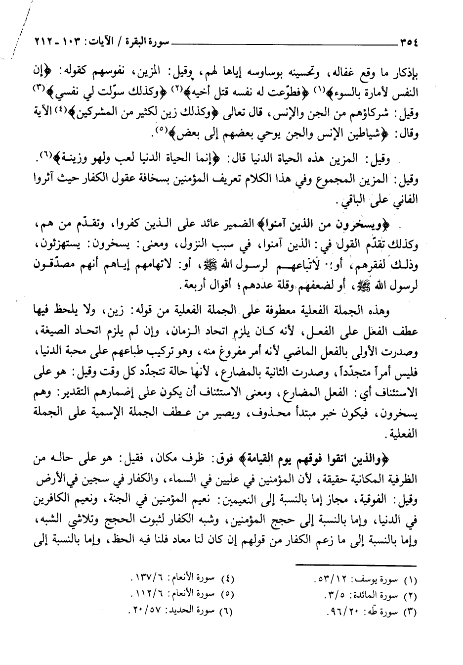 وَهَذِهِ الْجُمْلَةُ الْفِعْلِيَّةُ مَعْطُوفَةٌ عَلَى الْجُمْلَةِ الْفِعْلِيَّةِ مِنْ قَوْلِهِ: زُيِّنَ، وَلَا يُلْحَظُ فِيهَا عَطْفُ الْفِعْلِ عَلَى الْفِعْلِ، لِأَنَّهُ كَانَ يَلْزَمُ اتِّحَادُ الزَّمَانِ، وَإِنْ لَمْ يَلْزَمِ اتِّحَادُ الصِّيغَةِ، وَصُدِّرَتِ الْأُولَى بِالْفِعْلِ الْمَاضِي لِأَنَّهُ أَمْرٌ مَفْرُوغٌ مِنْهُ، وَهُوَ تَرْكِيبُ طِبَاعِهِمْ عَلَى مَحَبَّةِ الدُّنْيَا، فَلَيْسَ أَمْرًا مُتَجَدِّدًا، وَصُدِّرَتِ الثَّانِيَةُ بِالْمُضَارِعِ، لِأَنَّهَا حَالَةٌ تَتَجَدَّدُ كُلَّ وَقْتٍ وَقِيلَ: هُوَ عَلَى الِاسْتِئْنَافِ أَيِ: الْفِعْلُ الْمُضَارِعُ، وَمَعْنَى الِاسْتِئْنَافِ أَنْ يَكُونَ عَلَى إِضْمَارِهِمُ التَّقْدِيرَ: وَهُمْ يَسْخَرُونَ، فَيَكُونُ خَبَرَ مُبْتَدَأٍ مَحْذُوفٍ، وَيَصِيرُ مِنْ عَطْفِ الْجُمْلَةِ الِاسْمِيَّةِ عَلَى الْجُمْلَةِ الْفِعْلِيَّةِ.