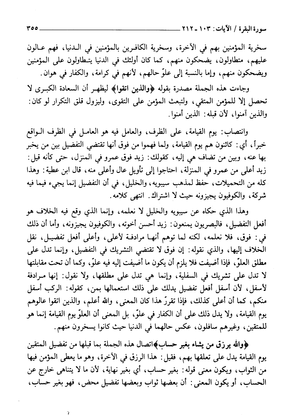 وَهَذَا الَّذِي حَكَاهُ عَنْ سِيبَوَيْهِ وَالْخَلِيلِ لَا نَعْلَمُهُ، وَإِنَّمَا الَّذِي وَقَعَ فِيهِ الْخِلَافُ هُوَ أَفْعَلُ التَّفْضِيلِ، فَالْبَصْرِيُّونَ يَمْنَعُونَ: زَيْدٌ أَحْسَنُ إِخْوَتِهِ، وَالْكُوفِيُّونَ يُجِيزُونَهُ، وَأَمَّا أَنَّ ذَلِكَ فِي: فَوْقَ، فَلَا نَعْلَمُهُ، لَكِنَّهُ لَمَّا تَوَهَّمَ أَنَّهَا مُرَادِفَةٌ لِأَعْلَى، وَأَعْلَى أَفْعَلُ تَفْضِيلٍ، نَقَلَ الْخِلَافَ إِلَيْهَا، وَالَّذِي نَقُولُهُ: إِنَّ فَوْقَ لَا تَقْتَضِي التَّشْرِيكَ فِي التَّفْضِيلِ، وَإِنَّمَا تَدُلُّ عَلَى مُطْلَقِ الْعُلُوِّ، فَإِذَا أُضِيفَتْ فَلَا يَلْزَمُ أَنْ يَكُونَ مَا أُضِيفَتْ إِلَيْهِ فِيهِ عُلُوٌّ، وَكَمَا أَنَّ تَحْتَ مُقَابِلَتَهَا لَا تَدُلُّ عَلَى تَشْرِيكٍ فِي السُّفْلِيَّةِ، وَإِنَّمَا هِيَ تَدُلُّ عَلَى مُطْلَقِهَا، وَلَا نقول: إنها مرادفة لأسفل، لِأَنَّ أَسْفَلَ أَفْعَلُ تَفْضِيلٍ يَدُلُّكَ عَلَى ذَلِكَ اسْتِعْمَالُهَا بمن، كَقَوْلِهِ: الرَّكْبُ أَسْفَلَ مِنْكُمْ، كَمَا أَنَّ أَعْلَى كَذَلِكَ، فَإِذَا تَقَرَّرَ هَذَا كَانَ الْمَعْنَى، وَاللَّهُ أَعْلَمُ، وَالَّذِينَ اتَّقَوْا عَالُوهُمْ يَوْمَ الْقِيَامَةِ، وَلَا يَدُلُّ ذَلِكَ عَلَى أَنَّ الْكُفَّارَ فِي عُلُوٍّ، بَلِ الْمَعْنَى أَنَّ الْعُلُوَّ يَوْمَ الْقِيَامَةِ إِنَّمَا هُوَ لِلْمُتَّقِينَ، وَغَيْرُهُمْ سَافِلُونَ، عَكْسُ حَالِهِمَا فِي الدُّنْيَا حَيْثُ كَانُوا يَسْخَرُونَ مِنْهُمْ.