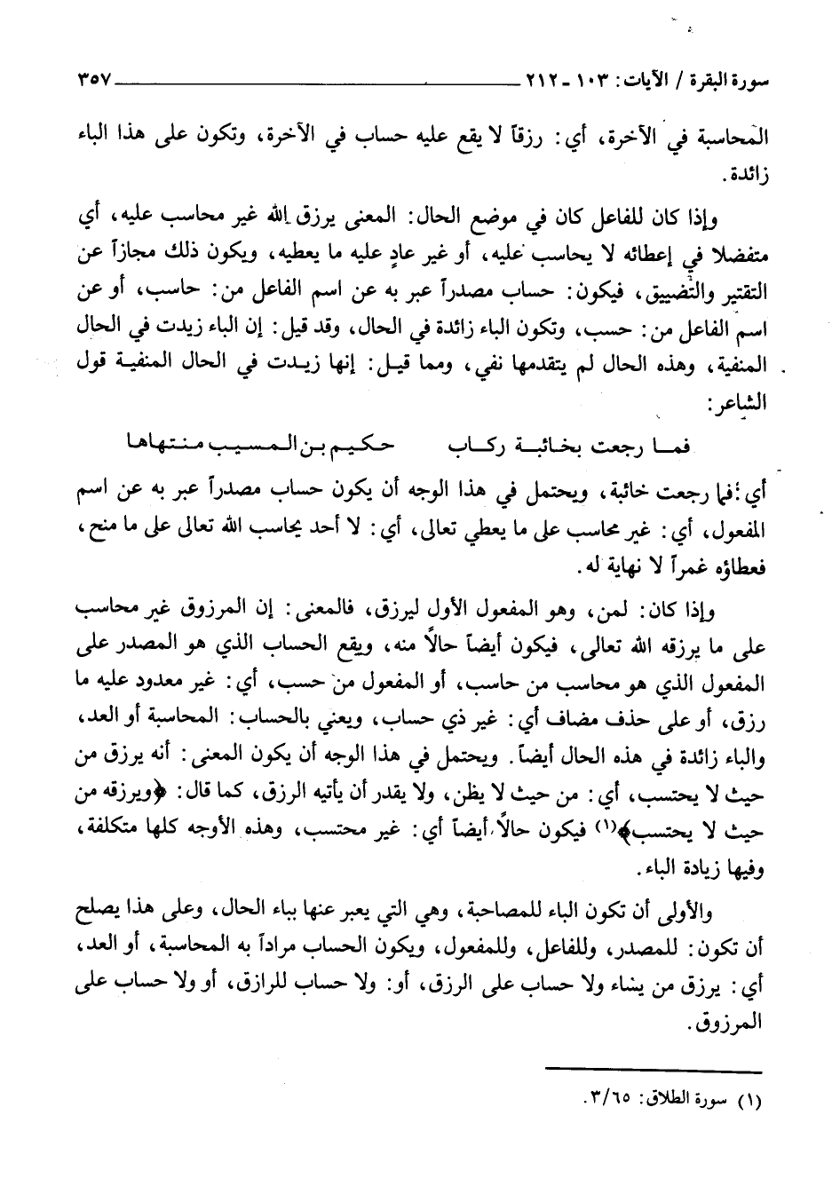 وَإِذَا كَانَ لِلْفَاعِلِ كَانَ فِي مَوْضِعِ الْحَالِ: الْمَعْنَى يَرْزُقُ اللَّهُ غَيْرَ مُحَاسِبٍ عَلَيْهِ، أَيْ مُتَفَضِّلًا فِي إِعْطَائِهِ لَا يُحَاسِبُ عَلَيْهِ، أَوْ غَيْرَ عَادٍّ عَلَيْهِ مَا يُعْطِيهِ، وَيَكُونُ ذَلِكَ مَجَازًا عَنِ التَّقْتِيرِ وَالتَّضْيِيقِ، فَيَكُونُ: حِسَابُ مَصْدَرًا عُبِّرَ بِهِ عَنِ اسْمِ الْفَاعِلِ مِنْ: حَاسَبَ، أَوْ عَنِ اسْمِ الْفَاعِلِ مِنْ: حَسَبَ، وَتَكُونُ الْبَاءُ زَائِدَةً فِي الْحَالِ، وَقَدْ قِيلَ: إِنَّ الْبَاءَ زِيدَتْ فِي الْحَالِ الْمَنْفِيَّةِ، وَهَذِهِ الْحَالُ لَمْ يَتَقَدَّمْهَا نَفْيٌ، وَمِمَّا قِيلَ: إِنَّهَا زِيدَتْ فِي الْحَالِ الْمَنْفِيَّةِ قَوْلُ الشَّاعِرِ: