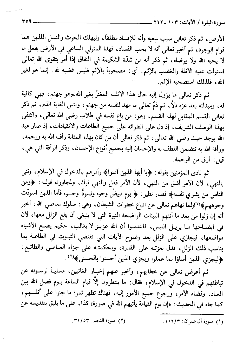 الْأَرْضِ، ثُمَّ ذَكَرَ تَعَالَى سَبَبَ سَعْيِهِ وَأَنَّهُ لِلْإِفْسَادِ مُطْلَقًا، وَلِيُهْلِكَ الْحَرْثَ وَالنَّسْلَ اللَّذَيْنِ هُمَا قِوَامُ الْوُجُودِ، ثُمَّ أَخْبَرَ تَعَالَى أَنَّهُ لَا يُحِبُّ الْفَسَادَ، فَهَذَا الْمُتَوَلِّي السَّاعِي فِي الْأَرْضِ يَفْعَلُ مَا لَا يُحِبُّهُ اللَّهُ وَلَا يَرْضَاهُ، ثُمَّ ذَكَرَ أَنَّهُ مِنْ شِدَّةِ الشَّكِيمَةِ فِي النِّفَاقِ إِذَا أمر بتقوى الله تعالى اسْتَوْلَتْ عَلَيْهِ الْأَنَفَةُ وَالْغَضَبُ بِالْإِثْمِ. أَيْ: مَصْحُوبًا بِالْإِثْمِ فَلَيْسَ غَضَبُهُ لِلَّهِ. إِنَّمَا هُوَ لِغَيْرِ اللَّهِ، فَلِذَلِكَ اسْتَصْحَبَهُ الْإِثْمُ.