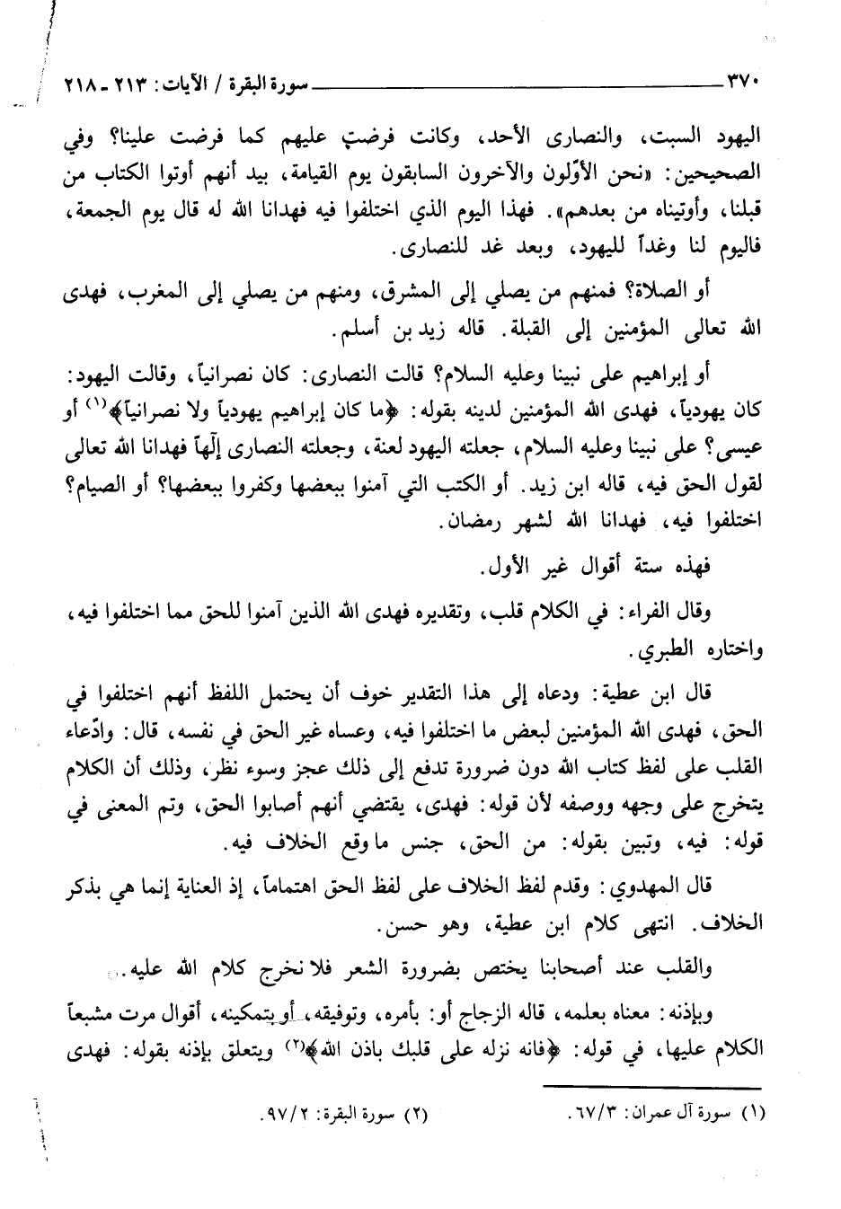 كَانَ يَهُودِيًّا، فَهَدَى اللَّهُ الْمُؤْمِنِينَ لِدِينِهِ بِقَوْلِهِ: مَا كانَ إِبْراهِيمُ يَهُودِيًّا وَلا نَصْرانِيًّا «1» أَوْ عِيسَى؟ عَلَى نَبِيِّنَا وَعَلَيْهِ السَّلَامُ، جَعَلَتْهُ الْيَهُودُ لَعْنَةً، وَجَعَلَتْهُ النَّصَارَى إِلَهًا فَهَدَانَا اللَّهُ تَعَالَى لِقَوْلِ الْحَقِّ فِيهِ، قَالَهُ ابْنُ زَيْدٍ. أَوِ الْكُتُبُ الَّتِي آمَنُوا بِبَعْضِهَا وَكَفَرُوا بِبَعْضِهَا؟ أَوِ الصِّيَامُ؟
