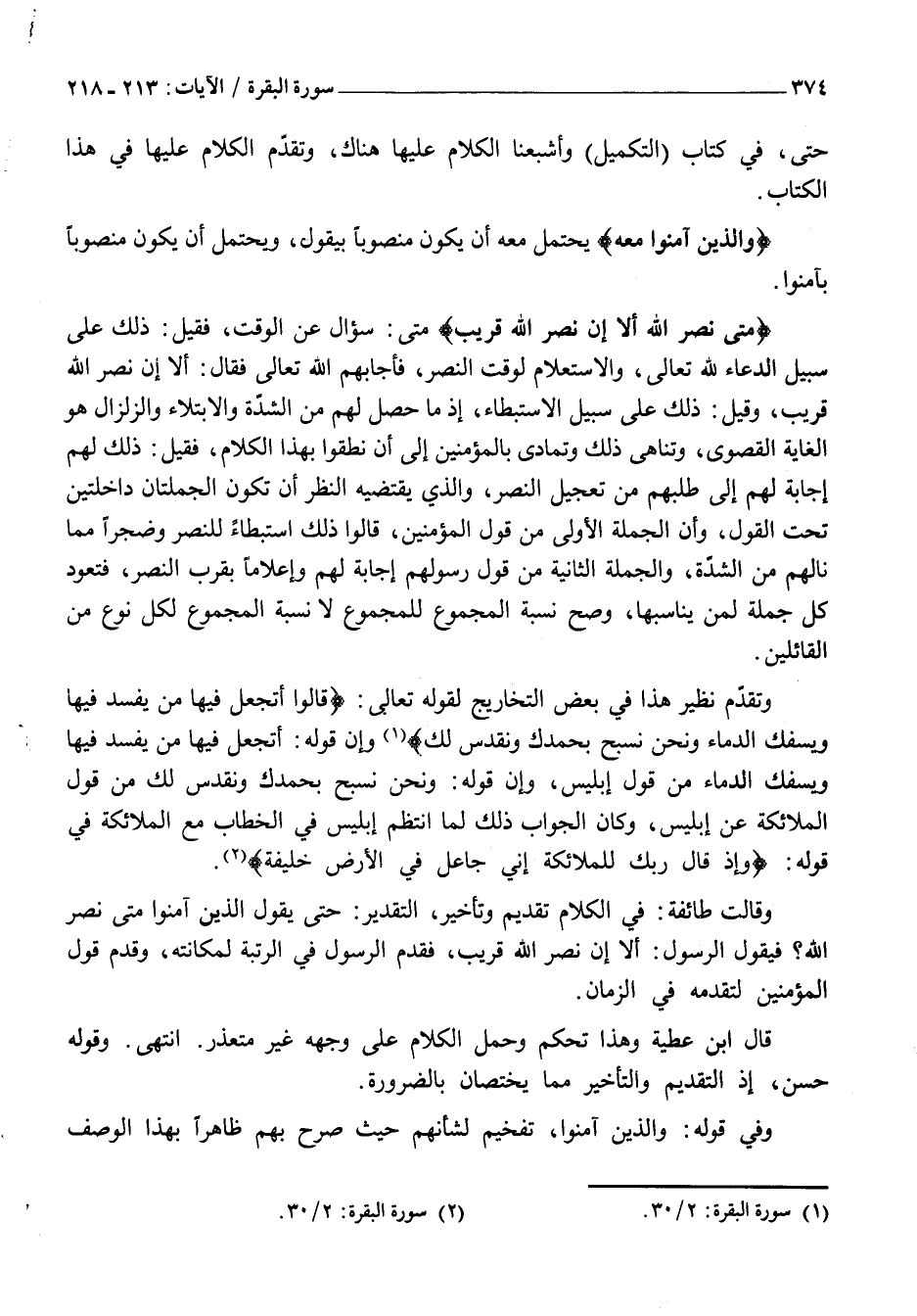 وَقَالَتْ طَائِفَةٌ: فِي الْكَلَامِ تَقْدِيمٌ وَتَأْخِيرٌ، التَّقْدِيرُ: حَتَّى يَقُولَ الَّذِينَ آمَنُوا مَتَّى نَصْرُ اللَّهِ؟ فَيَقُولُ الرَّسُولُ: أَلَا إِنَّ نَصَرَ اللَّهُ قَرِيبٌ، فَقَدَّمَ الرَّسُولَ فِي الرُّتْبَةِ لِمَكَانَتِهِ، وَقَدَّمَ قَوْلَ الْمُؤْمِنِينَ لِتَقَدُّمِهِ فِي الزَّمَانِ.