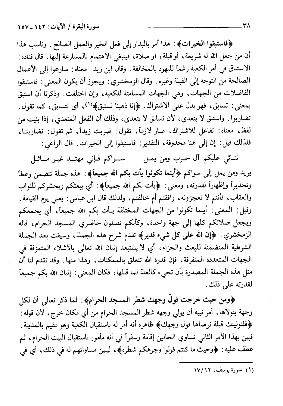 وَقِيلَ: الْمَعْنَى: أَيْنَمَا تَكُونُوا مِنَ الْجِهَاتِ الْمُخْتَلِفَةِ يَأْتِ بِكُمُ اللَّهُ جَمِيعًا، أَيْ يَجْمَعُكُمْ وَيَجْعَلُ صَلَاتَكُمْ كُلَّهَا إِلَى جِهَةٍ وَاحِدَةٍ، وَكَأَنَّكُمْ تُصَلُّونَ حَاضِرِي الْمَسْجِدِ الحرام، قاله الزمخشري. نَّ اللَّهَ عَلى كُلِّ شَيْءٍ قَدِيرٌ