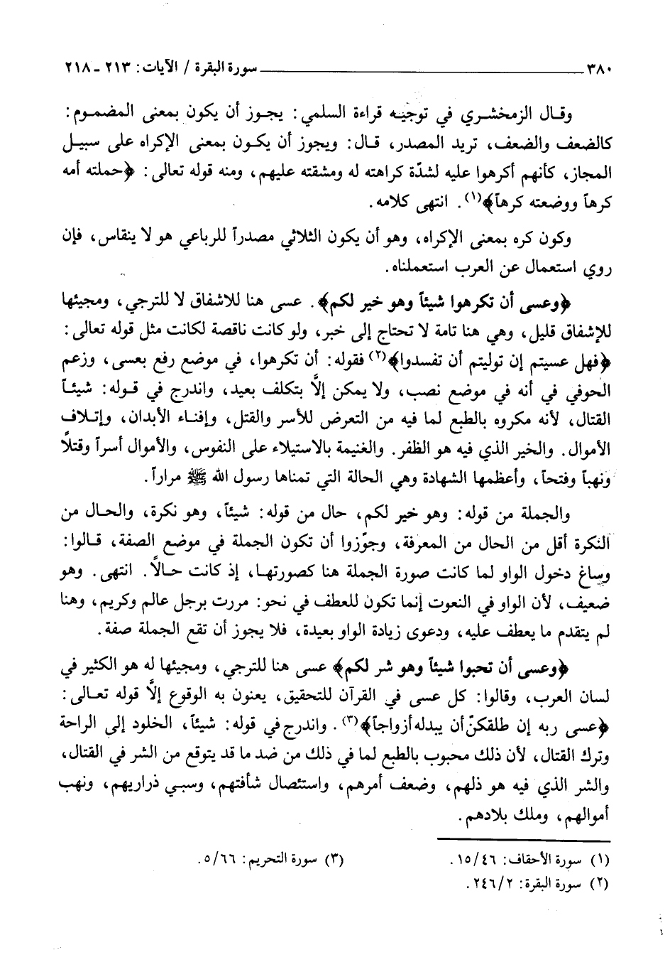 فَهَلْ عَسَيْتُمْ إِنْ تَوَلَّيْتُمْ أَنْ تُفْسِدُوا «2» فَقَوْلُهُ: أَنْ تَكْرَهُوا، فِي مَوْضِعِ رَفْعٍ بِعَسَى، وَزَعَمَ الْحَوْفِيُّ فِي أَنَّهُ فِي مَوْضِعِ نَصْبٍ، وَلَا يُمْكِنُ إِلَّا بِتَكَلُّفٍ بَعِيدٍ، وَانْدَرَجَ فِي قَوْلِهِ: شَيْئًا الْقِتَالُ، لِأَنَّهُ مَكْرُوهٌ بِالطَّبْعِ لِمَا فِيهِ مِنَ التَّعَرُّضِ لِلْأَسْرِ وَالْقَتْلِ، وَإِفْنَاءِ الْأَبْدَانِ، وَإِتْلَافِ الْأَمْوَالِ. وَالْخَيْرُ الَّذِي فِيهِ هُوَ الظَّفَرُ. وَالْغَنِيمَةُ بِالِاسْتِيلَاءِ عَلَى النُّفُوسِ، وَالْأَمْوَالِ أَسْرًا وَقَتْلًا وَنَهْبًا وَفَتْحًا، وَأَعْظَمُهَا الشَّهَادَةُ وَهِيَ الْحَالَةُ الَّتِي تَمَنَّاهَا رَسُولُ اللَّهِ صَلَّى اللَّهُ عَلَيْهِ وَسَلَّمَ مِرَارًا.