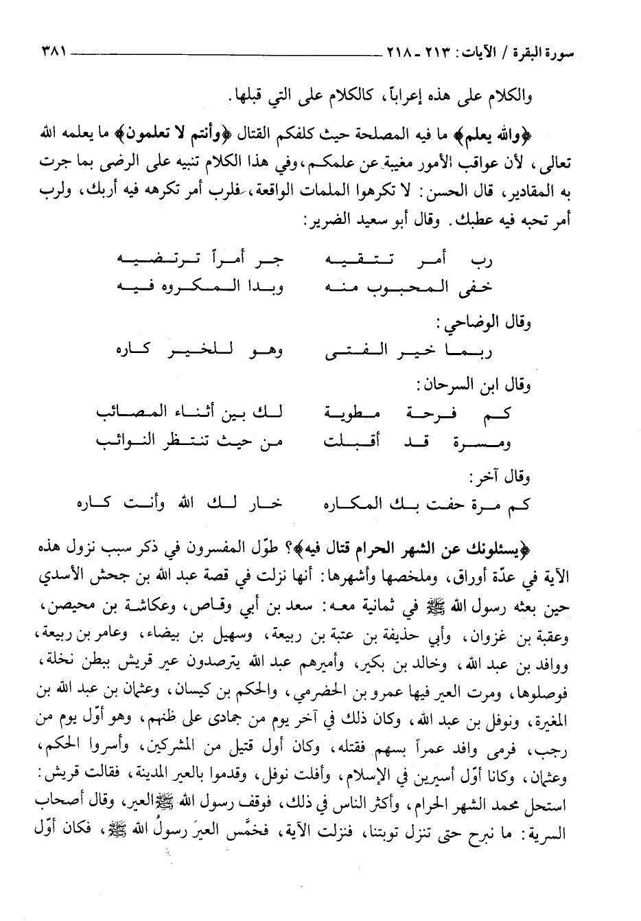 يَسْئَلُونَكَ عَنِ الشَّهْرِ الْحَرامِ قِتالٍ فِيهِ؟ طَوَّلَ الْمُفَسِّرُونَ فِي ذكر سَبَبُ نُزُولِ هَذِهِ الْآيَةِ فِي عِدَّةِ أَوْرَاقٍ، وَمُلَخَّصُهَا وَأَشْهَرُهَا: أَنَّهَا نَزَلَتْ فِي قِصَّةِ عَبْدِ اللَّهِ بْنِ جَحْشٍ الْأَسَدِيِّ حِينَ بعثة رسول الله صلى اللَّهُ عَلَيْهِ وَسَلَّمَ فِي ثَمَانِيَةٍ مَعَهُ: سَعْدِ بْنِ أَبِي وَقَّاصٍ، وَعُكَاشَةَ بْنِ محيصن، وَعُقْبَةَ بْنِ غَزْوَانَ، وَأَبِي حُذَيْفَةَ بْنِ عُتْبَةَ بْنِ رَبِيعَةَ، وَسُهَيْلِ بْنِ بَيْضَاءَ، وَعَامِرِ بْنِ رَبِيعَةَ، وَوَافِدِ بن عبد الله، وخالد بْنِ بُكَيْرٍ، وَأَمِيرِهِمْ عَبْدِ اللَّهِ يَتَرَصَّدُونَ عِيرَ قُرَيْشٍ بِبَطْنِ نَخْلَةَ، فَوَصَلُوهَا، وَمَرَّتِ الْعِيرُ فِيهَا عَمْرُو بْنُ الْحَضْرَمِيِّ، وَالْحَكَمُ بْنُ كَيْسَانَ، وَعُثْمَانُ بْنُ عَبْدِ اللَّهِ بْنِ الْمُغِيرَةِ، وَنَوْفَلُ بْنُ عَبْدِ اللَّهِ، وَكَانَ ذَلِكَ فِي آخِرِ يَوْمٍ مِنْ جُمَادَى عَلَى ظَنِّهِمْ، وَهُوَ أَوَّلَ يَوْمٍ مِنْ رَجَبٍ، فَرَمَى وَافِدٌ عَمْرًا بِسَهْمٍ فَقَتَلَهُ، وَكَانَ أَوَّلَ قَتِيلٍ مِنَ الْمُشْرِكِينَ، وَأَسَرُوا الْحَكَمَ، وَعُثْمَانَ، وَكَانَا أَوَّلَ أَسِيرَيْنِ فِي الْإِسْلَامِ، وَأَفْلَتَ نَوْفَلٌ، وَقَدِمُوا بِالْعِيرِ الْمَدِينَةَ، فَقَالَتْ قُرَيْشٌ: