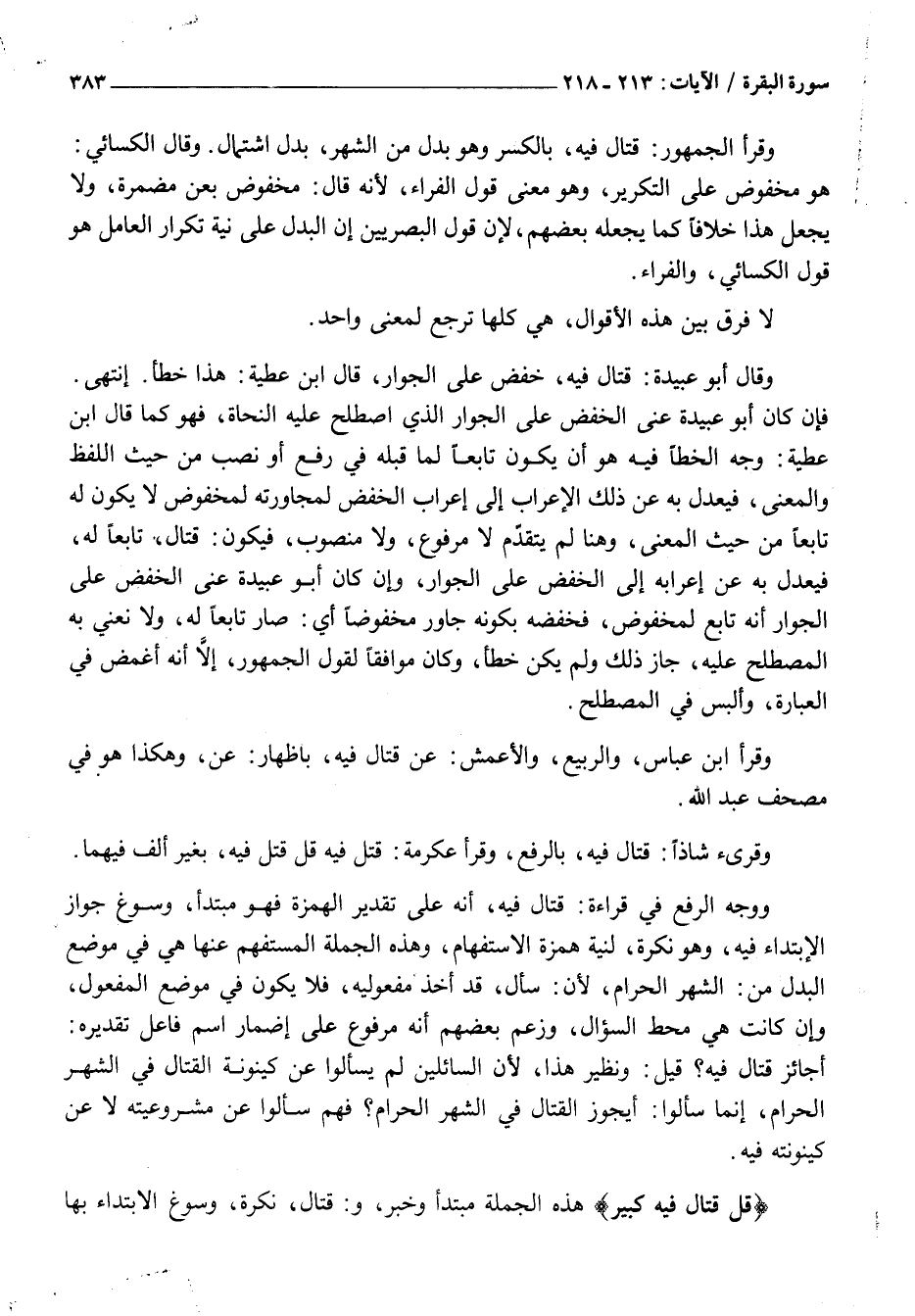 فَإِنْ كَانَ أَبُو عُبَيْدَةَ عَنَى الْخَفْضَ عَلَى الْجِوَارِ الَّذِي اصْطَلَحَ عَلَيْهِ النُّحَاةُ، فَهُوَ كَمَا قَالَ ابْنُ عَطِيَّةَ: وَجْهُ الْخَطَأِ فِيهِ هُوَ أَنْ يَكُونَ تَابِعًا لِمَا قَبْلَهُ فِي رَفْعٍ أَوْ نَصْبٍ من حيث اللفظ والمعنى، فَيُعْدَلُ بِهِ عَنْ ذَلِكَ الْإِعْرَابِ إِلَى إِعْرَابِ الْخَفْضِ لِمُجَاوَرَتِهِ لِمَخْفُوضٍ لَا يَكُونُ لَهُ تَابِعًا مِنْ حَيْثُ الْمَعْنَى، وَهُنَا لَمْ يَتَقَدَّمْ لَا مَرْفُوعٌ، وَلَا مَنْصُوبٌ، فَيَكُونُ: قِتَالٍ، تَابِعًا لَهُ، فَيُعْدَلُ بِهِ عَنْ إِعْرَابِهِ إِلَى الْخَفْضِ عَلَى الْجِوَارِ، وَإِنْ كَانَ أَبُو عُبَيْدَةَ عَنَى الْخَفْضَ عَلَى الْجِوَارِ أَنَّهُ تَابِعٌ لِمَخْفُوضٍ، فَخَفَضَهُ بِكَوْنِهِ جَاوَرَ مَخْفُوضًا أَيْ: صَارَ تَابِعًا لَهُ، وَلَا نَعْنِي بِهِ الْمُصْطَلَحَ عَلَيْهِ، جَازَ ذَلِكَ وَلَمْ يَكُنْ خَطَأً، وَكَانَ مُوَافِقًا لِقَوْلِ الْجُمْهُورِ، إِلَّا أَنَّهُ أَغْمَضُ فِي الْعِبَارَةِ، وَأَلْبَسُ فِي الْمُصْطَلَحِ.