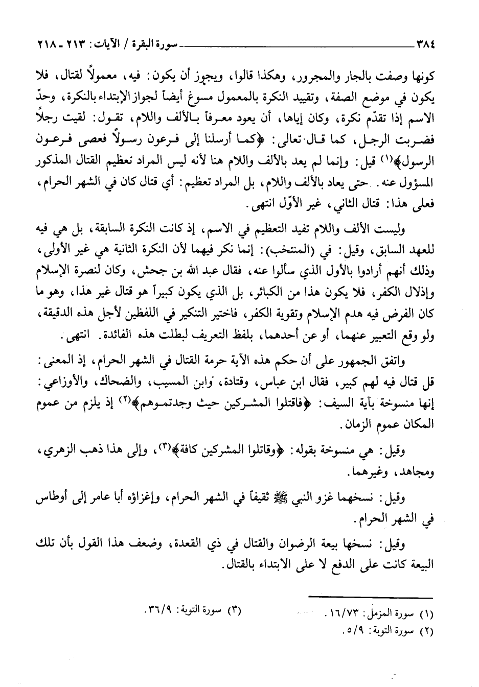وَلَيْسَتِ الْأَلِفُ وَاللَّامُ تُفِيدُ التَّعْظِيمَ فِي الِاسْمِ، إِذْ كَانَتِ النَّكِرَةُ السَّابِقَةُ، بَلْ هِيَ فِيهِ لِلْعَهْدِ السَّابِقِ، وَقِيلَ: فِي (الْمُنْتَخَبِ) : إِنَّمَا نُكِّرَ فِيهِمَا لِأَنَّ النَّكِرَةَ الثَّانِيَةَ هِيَ غَيْرُ الْأُولَى، وَذَلِكَ أَنَّهُمْ أَرَادُوا بِالْأَوَّلِ الَّذِي سَأَلُوا عَنْهُ، فَقَالَ عَبْدُ اللَّهِ بْنُ جحش، وَكَانَ لِنُصْرَةِ الْإِسْلَامِ وَإِذْلَالِ الْكُفْرِ، فَلَا يَكُونُ هَذَا مِنَ الْكَبَائِرِ، بَلِ الَّذِي يَكُونُ كَبِيرًا هُوَ قِتَالٌ غَيْرُ هَذَا، وَهُوَ مَا كان الفرض فِيهِ هَدْمَ الْإِسْلَامِ وَتَقْوِيَةَ الْكُفْرِ، فَاخْتِيرَ التَّنْكِيرُ فِي اللَّفْظَيْنِ لِأَجْلِ هَذِهِ الدَّقِيقَةِ، وَلَوْ وَقَعَ التَّعْبِيرُ عَنْهُمَا، أَوْ عَنْ أَحَدِهِمَا، بِلَفْظِ التَّعْرِيفِ لَبَطَلَتْ هَذِهِ الْفَائِدَةُ. انْتَهَى.