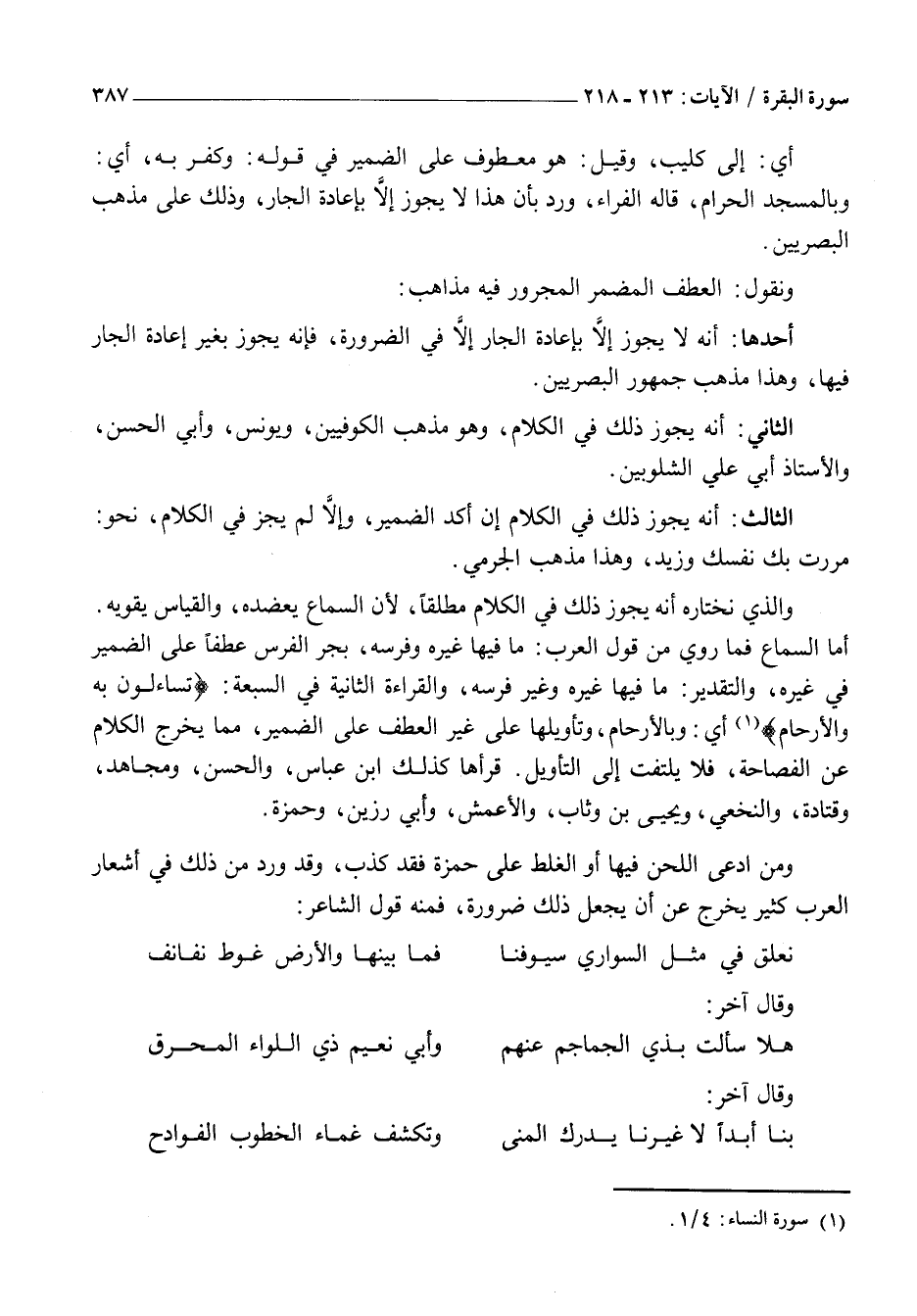 وَبِالْمَسْجِدِ الْحَرَامِ، قَالَهُ الْفَرَّاءُ، وَرَدَّ بِأَنَّ هَذَا لَا يَجُوزُ إِلَّا بِإِعَادَةِ الْجَارِّ، وَذَلِكَ عَلَى مَذْهَبِ الْبَصْرِيِّينَ.