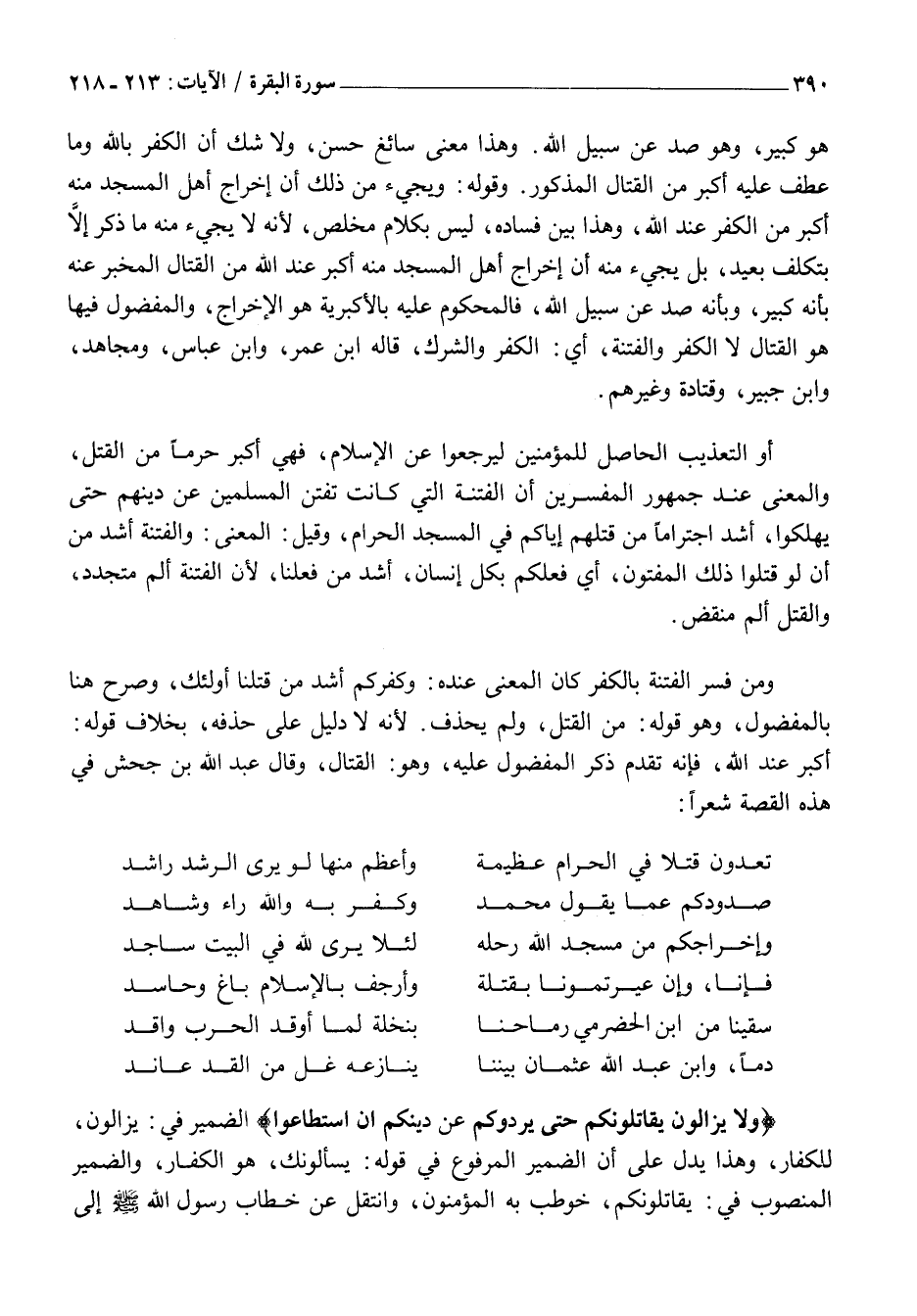 هُوَ كَبِيرٌ، وَهُوَ صَدٌّ عَنْ سَبِيلِ اللَّهِ. وَهَذَا مَعْنًى سَائِغٌ حَسَنٌ، وَلَا شَكَّ أَنَّ الْكُفْرَ بِاللَّهِ وَمَا عُطِفَ عَلَيْهِ أَكْبَرُ مِنَ الْقِتَالِ الْمَذْكُورِ. وَقَوْلُهُ: وَيَجِيءُ مِنْ ذَلِكَ أَنَّ إِخْرَاجَ أَهْلِ الْمَسْجِدِ مِنْهُ أَكْبَرُ مِنَ الْكُفْرِ عِنْدَ اللَّهِ، وَهَذَا بَيِّنٌ فَسَادُهُ، لَيْسَ بِكَلَامٍ مُخْلَصٍ، لِأَنَّهُ لَا يَجِيءُ مِنْهُ مَا ذَكَرَ إِلَّا بِتَكَلُّفٍ بَعِيدٍ، بَلْ يَجِيءُ مِنْهُ أَنَّ إِخْرَاجَ أَهْلِ الْمَسْجِدِ مِنْهُ أَكْبَرُ عِنْدَ اللَّهِ مِنَ الْقِتَالِ الْمُخْبَرِ عَنْهُ بِأَنَّهُ كَبِيرٌ، وَبِأَنَّهُ صَدٌّ عَنْ سَبِيلِ اللَّهِ، فَالْمَحْكُومُ عَلَيْهِ بِالْأَكْبَرِيَّةِ هُوَ الْإِخْرَاجُ، وَالْمَفْضُولُ فِيهَا هُوَ الْقِتَالُ لَا الْكُفْرُ وَالْفِتْنَةُ، أَيِ: الْكُفْرُ وَالشِّرْكُ، قَالَهُ ابْنُ عُمَرَ، وَابْنُ عَبَّاسٍ، وَمُجَاهِدٌ، وَابْنُ جُبَيْرٍ، وَقَتَادَةُ وَغَيْرُهُمْ.