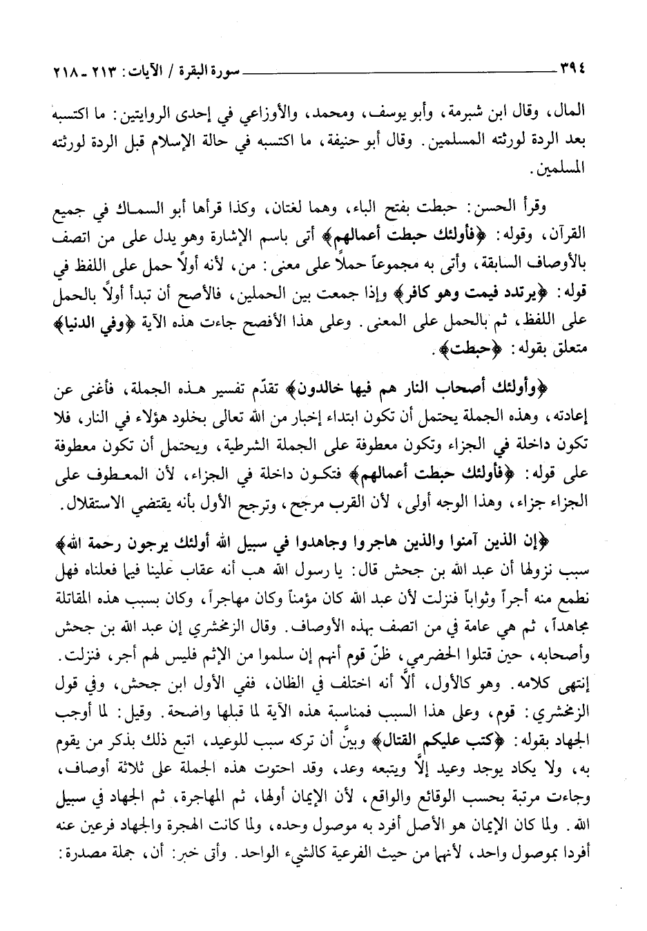 وَقَرَأَ الْحَسَنُ: حَبَطَتْ بِفَتْحِ الْبَاءِ، وَهُمَا لُغَتَانِ، وَكَذَا قَرَأَهَا أَبُو السَّمَّاكِ فِي جَمِيعِ الْقُرْآنِ، وَقَوْلُهُ: فَأُولئِكَ حَبِطَتْ أَعْمالُهُمْ أَتَى بِاسْمِ الْإِشَارَةِ وَهُوَ يَدُلُّ عَلَى مَنِ اتَّصَفَ بِالْأَوْصَافِ السَّابِقَةِ، وَأَتَى بِهِ مَجْمُوعًا حَمْلًا عَلَى مَعْنَى: مَنْ، لِأَنَّهُ أَوَّلًا حَمْلٌ عَلَى اللَّفْظِ فِي قَوْلِهِ: يَرْتَدِدْ مِنْكُمْ عَنْ دِينِهِ فَيَمُتْ وَهُوَ كافِرٌ وَإِذَا جَمَعْتَ بَيْنَ الْحَمْلَيْنِ، فَالْأَصَحُّ أَنْ تبدأ أَوَّلًا بِالْحَمْلِ عَلَى اللَّفْظِ، ثُمَّ بِالْحَمْلِ عَلَى الْمَعْنَى. وَعَلَى هَذَا الْأَفْصَحِ جَاءَتْ هذه الآيةو فِي الدُّنْيا مُتَعَلِّقٌ بِقَوْلِهِ: حَبِطَتْ.