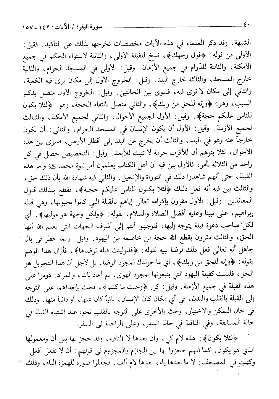 ، أَيْ لِكُلِّ صَاحِبِ دَعْوَةِ قِبْلَةٌ يَتَوَجَّهُ إِلَيْهَا، فَتَوَجَّهُوا أَنْتُمْ إِلَى أَشْرَفِ الْجِهَاتِ الَّتِي يَعْلَمُ اللَّهُ أَنَّهَا الْحَقُّ، وَالثَّالِثُ مَقْرُونٌ بِقَطْعِ اللَّهِ حُجَّةَ مَنْ خَاصَمَهُ مِنَ الْيَهُودِ. وَقِيلَ: رُبَّمَا خَطَرَ فِي بَالِ جَاهِلٍ أَنَّهُ تَعَالَى فَعَلَ ذَلِكَ لِرِضَا نَبِيِّهِ لِقَوْلِهِ: فَلَنُوَلِّيَنَّكَ قِبْلَةً تَرْضاها، فَأَزَالَ هَذَا الْوَهْمَ بِقَوْلِهِ: وَإِنَّهُ لَلْحَقُّ مِنْ رَبِّكَ، أَيْ مَا حَوَّلْنَاكَ لِمُجَرَّدِ الرِّضَا، بَلْ لِأَجْلِ أَنْ هَذَا التَّحْوِيلَ هُوَ الْحَقُّ، فَلَيْسَتْ كَقِبْلَةِ الْيَهُودِ الَّتِي يَتَّبِعُونَهَا بِمُجَرَّدِ الْهَوَى، ثُمَّ أَعَادَ ثَالِثًا، وَالْمُرَادُ: دُومُوا عَلَى هَذِهِ الْقِبْلَةِ فِي جَمِيعِ الْأَزْمِنَةِ. وَقِيلَ: كرر وَحَيْثُ ما كُنْتُمْ، فَحَثَّ بِإِحْدَاهُمَا عَلَى التَّوَجُّهِ إِلَى الْقِبْلَةِ بِالْقَلْبِ وَالْبَدَنِ، فِي أَيْ مَكَانٍ كَانَ الْإِنْسَانُ، نَائِيًا كَانَ عَنْهَا، أَوْ دَانِيًا مِنْهَا، وَذَلِكَ فِي حَالِ التَّمَكُّنِ وَالِاخْتِيَارِ، وَحَثَّ بِالْأُخْرَى عَلَى التَّوَجُّهِ بِالْقَلْبِ نَحْوَهُ عِنْدَ اشْتِبَاهِ الْقِبْلَةِ فِي حَالَةِ الْمُسَابَقَةِ، وَفِي النَّافِلَةِ فِي حَالَةِ السَّفَرِ، وَعَلَى الرَّاحِلَةِ فِي السَّفَرِ.