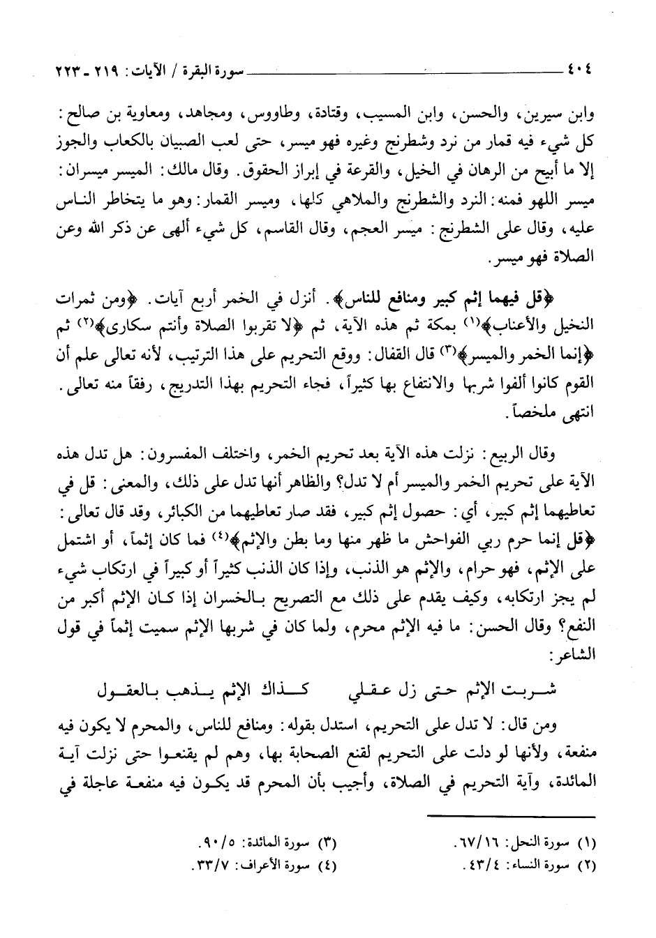 قُلْ إِنَّما حَرَّمَ رَبِّيَ الْفَواحِشَ مَا ظَهَرَ مِنْها وَما بَطَنَ وَالْإِثْمَ «4» فَمَا كَانَ إِثْمًا، أَوِ اشْتَمَلَ عَلَى الْإِثْمِ، فَهُوَ حَرَامٌ، وَالْإِثْمُ هُوَ الذَّنْبُ، وَإِذَا كَانَ الذَّنْبُ كَثِيرًا أَوْ كَبِيرًا فِي ارْتِكَابِ شَيْءٍ لَمْ يَجُزِ ارْتِكَابُهُ، وَكَيْفَ يُقْدَمُ عَلَى ذَلِكَ مَعَ التَّصْرِيحِ بِالْخُسْرَانِ إِذَا كَانَ الْإِثْمُ أَكْبَرَ مِنَ النَّفْعِ؟ وَقَالَ الْحَسَنُ: مَا فِيهِ الْإِثْمُ مُحَرَّمٌ، وَلَمَّا كَانَ فِي شُرْبِهَا الْإِثْمُ سُمِّيَتْ إِثْمًا فِي قَوْلِ الشَّاعِرِ: