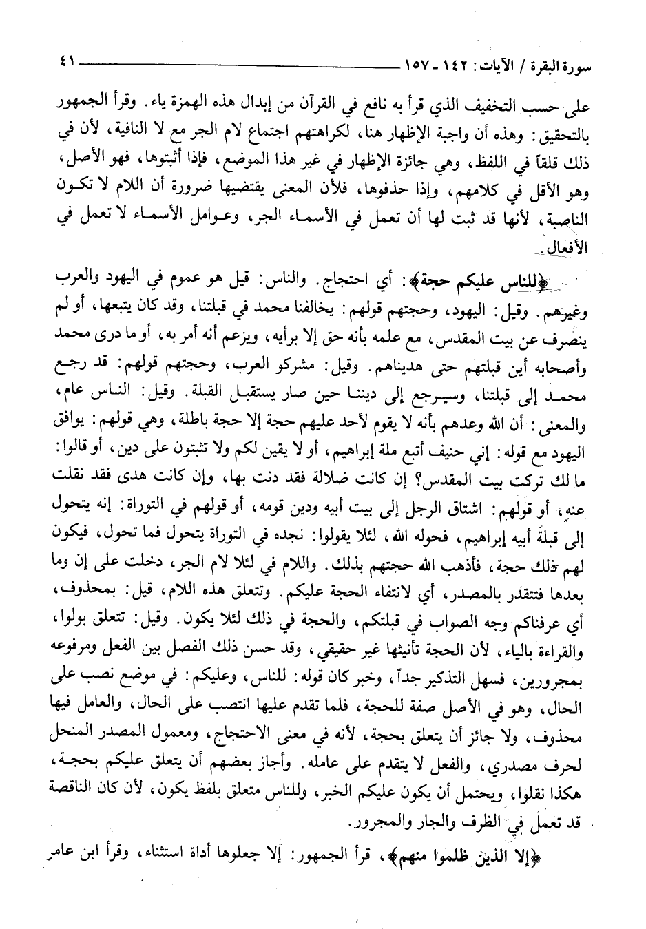 مَا لَكَ تَرَكْتَ بَيْتَ الْمَقْدِسِ؟ إِنْ كَانَتْ ضَلَالَةً فَقَدْ دِنْتَ بِهَا، وَإِنْ كَانَتْ هُدًى فَقَدْ نَقَلْتَ عَنْهُ، أَوْ قَوْلُهُمُ: اشْتَاقَ الرَّجُلُ إِلَى بَيْتِ أَبِيهِ وَدِينِ قَوْمِهِ، أَوْ قَوْلُهُمْ فِي التَّوْرَاةِ: إِنَّهُ يَتَحَوَّلُ إِلَى قِبْلَةِ أَبِيهِ إِبْرَاهِيمَ، فَحَوَّلَهُ اللَّهُ، لِئَلَّا يَقُولُوا: نَجِدُهُ فِي التَّوْرَاةِ يَتَحَوَّلُ فَمَا تَحَوَّلَ، فَيَكُونُ لَهُمْ ذَلِكَ حُجَّةً، فَأَذْهَبَ اللَّهُ حُجَّتَهُمْ بِذَلِكَ. وَاللَّامُ فِي لِئَلَّا لَامُ الْجَرِّ، دَخَلَتْ عَلَى إِنْ وَمَا بَعْدَهَا فَتَتَقَدَّرُ بِالْمَصْدَرِ، أَيْ لِانْتِفَاءِ الْحُجَّةِ عَلَيْكُمْ. وَتَتَعَلَّقُ هَذِهِ اللَّامُ، قِيلَ: بِمَحْذُوفٍ، أَيْ عَرَّفْنَاكُمْ وَجْهَ الصَّوَابِ فِي قِبْلَتِكُمْ، وَالْحُجَّةُ فِي ذَلِكَ لِئَلَّا يكون. وقيل: تتعلق بولوا، وَالْقِرَاءَةُ بِالْيَاءِ، لِأَنَّ الْحُجَّةَ تَأْنِيثُهَا غَيْرُ حَقِيقِيٍّ، وَقَدْ حَسُنَ ذَلِكَ الْفَصْلُ بَيْنَ الْفِعْلِ وَمَرْفُوعِهِ بِمَجْرُورَيْنِ، فَسَهُلَ التَّذْكِيرُ جِدًّا، وَخَبَرُ كَانَ قوله: للناس، وعليكم: فِي مَوْضِعِ نَصْبٍ عَلَى الْحَالِ، وَهُوَ فِي الْأَصْلِ صِفَةٌ لِلْحُجَّةِ، فَلَمَّا تَقَدَّمَ عَلَيْهَا انْتَصَبَ عَلَى الْحَالِ، وَالْعَامِلُ فِيهَا مَحْذُوفٌ، وَلَا جَائِزٌ أَنْ يَتَعَلَّقَ بِحُجَّةٍ، لِأَنَّهُ فِي مَعْنَى الِاحْتِجَاجِ، وَمَعْمُولُ الْمَصْدَرِ الْمُنْحَلِّ لِحَرْفٍ مَصْدَرِيٍّ، وَالْفِعْلِ لَا يَتَقَدَّمُ عَلَى عَامِلِهِ. وَأَجَازَ بَعْضُهُمْ أَنْ يَتَعَلَّقَ عَلَيْكُمْ بِحُجَّةٍ، هَكَذَا نَقَلُوا، وَيُحْتَمَلُ أَنْ يَكُونَ عَلَيْكُمُ الْخَبَرَ، وَلِلنَّاسُ مُتَعَلِّقٌ بِلَفْظِ يَكُونُ، لِأَنَّ كَانَ النَّاقِصَةَ قَدْ تَعْمَلُ فِي الظَّرْفِ وَالْجَارِّ وَالْمَجْرُورِ.