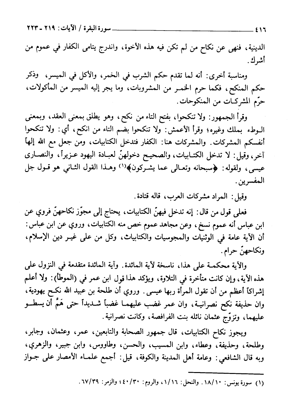 وَالْآيَةُ مُحْكَمَةٌ عَلَى هَذَا، نَاسِخَةٌ لِآيَةِ الْمَائِدَةِ. وَآيَةُ الْمَائِدَةِ مُتَقَدِّمَةٌ فِي النُّزُولِ عَلَى هَذِهِ الْآيَةِ، وَإِنْ كَانَتْ مُتَأَخِّرَةً فِي التِّلَاوَةِ، وَيُؤَكِّدُ هَذَا قَوْلُ ابْنِ عُمَرَ فِي (الْمُوَطَّأِ) : وَلَا أَعْلَمُ إِشْرَاكًا أَعْظَمَ مِنْ أَنْ تَقُولَ الْمَرْأَةُ رَبَّهَا عِيسَى. وَرُوِيَ أَنَّ طَلْحَةَ بْنَ عُبَيْدِ اللَّهِ نَكَحَ يَهُودِيَّةً، وَأَنَّ حُذَيْفَةَ نَكَحَ نَصْرَانِيَّةً، وَأَنَّ عُمَرَ غَضِبَ عَلَيْهِمَا غَضَبًا شَدِيدًا حَتَّى هَمَّ أَنْ يَسْطُوَ عَلَيْهِمَا، وَتَزَوَّجَ عُثْمَانُ نَائِلَةَ بِنْتَ الْفَرَافِصَةِ، وَكَانَتْ نَصْرَانِيَّةً.